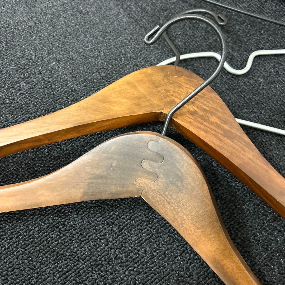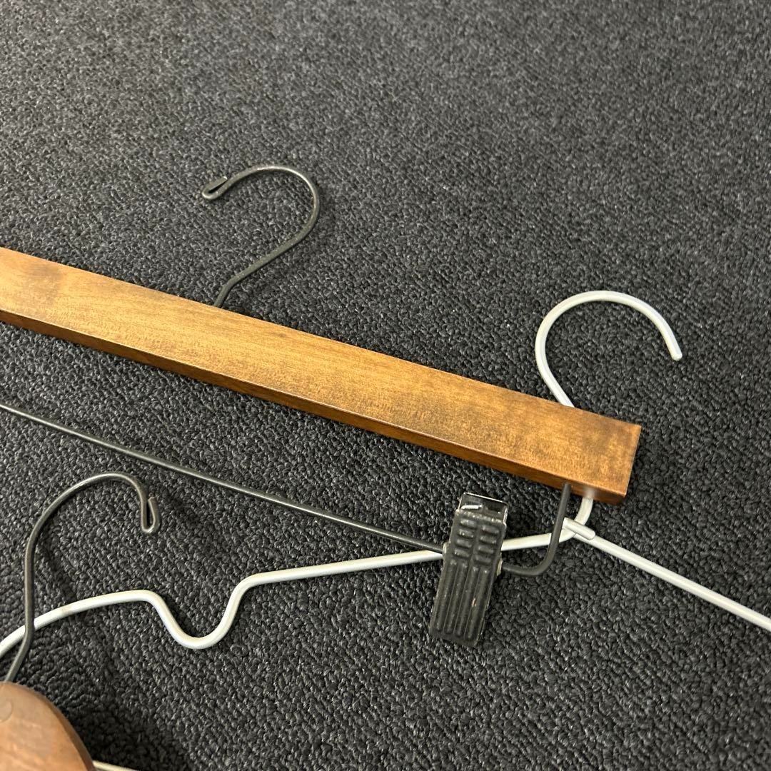 3本のブラウン木製ハンガーとクリップ付きハンガー