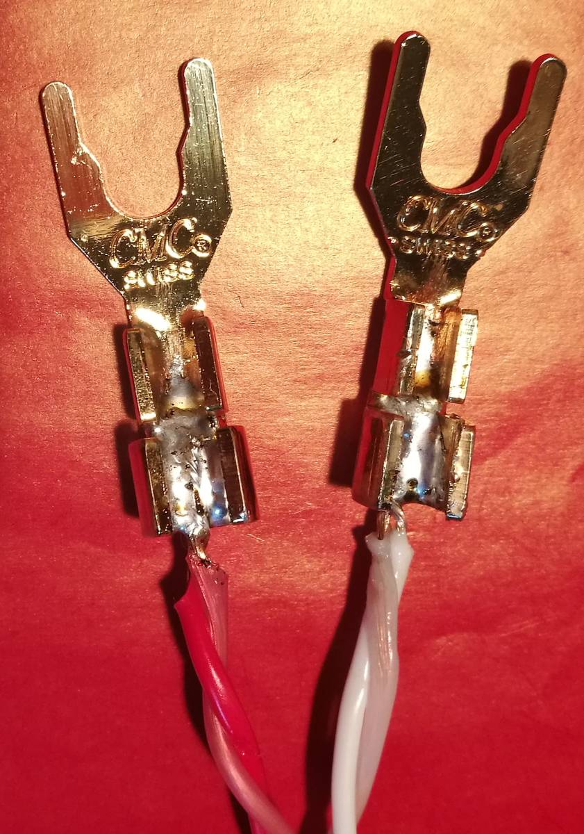 | ①CMCハイグレード純銅ラグ端子でほとんどの端子に接続可能です。 ②3~8ミリ径端子まで取付可能な標準的Yラグ端子です。 ③全長約38ミリ、外幅14ミリ、内幅6.2~8.9ミリ、厚み1.5ミリ。 ④カシメ専用工具がなくても60Wクラスの半田ごてで半田接続可能です。 ⑤熱収縮保護チューブ付。 | |