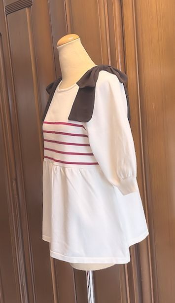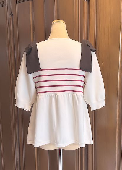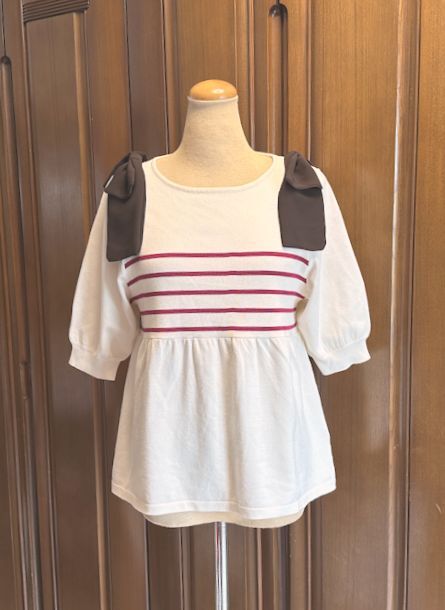 両肩に布帛のリボンが付いたニットプルオーバー。身頃は人気のペプラムシルエット。