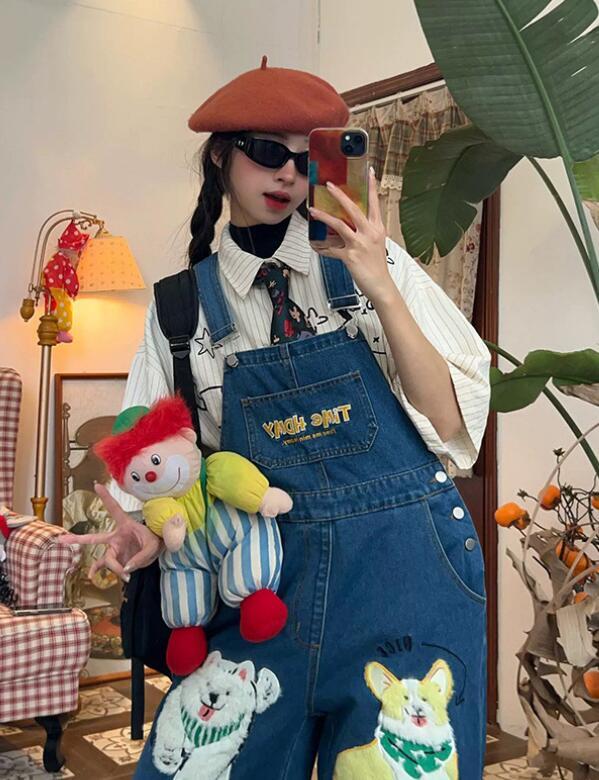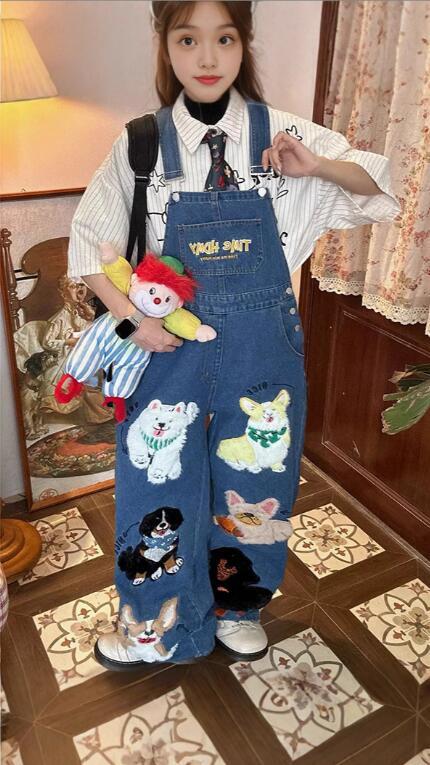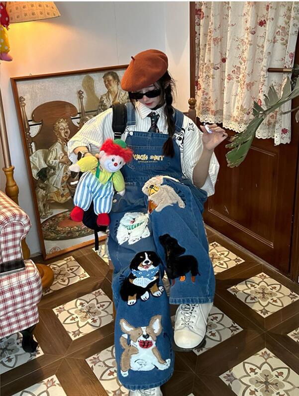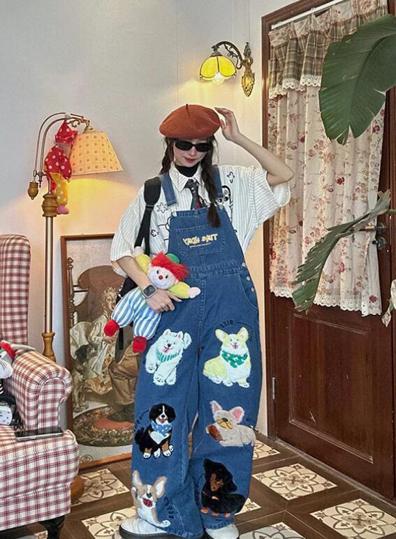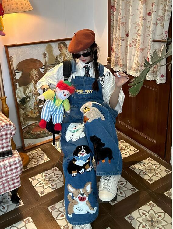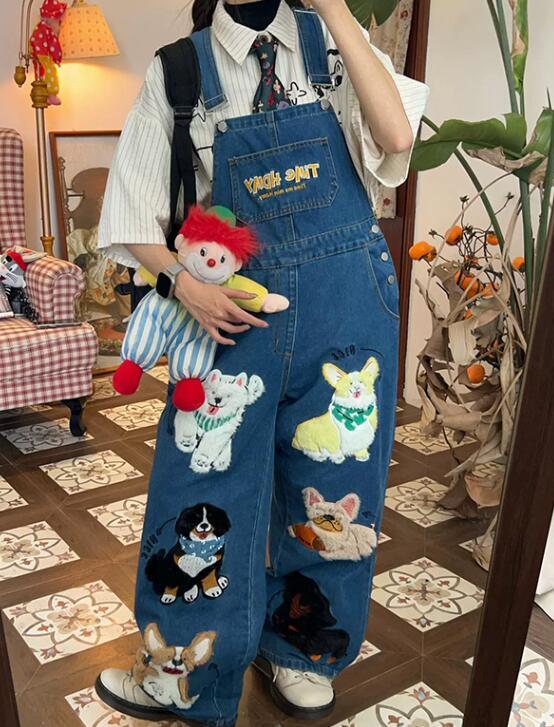 人気 オーバーオール ズボン S~2XLまで選べる デニム生地 ジーンズ オシャレ プリント犬柄 楽ちん 可愛デザイン ゆったり