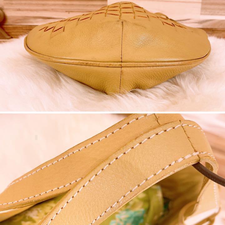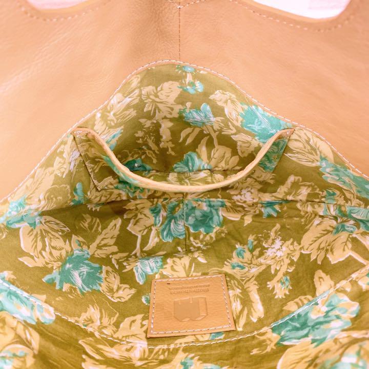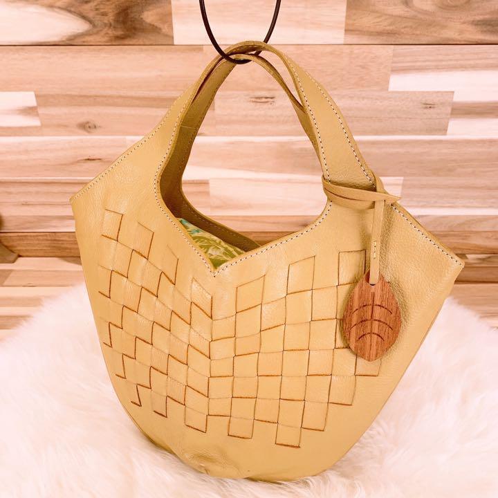 上品なベージュのレザーを丁寧に編み込んだ、柔らかくもしっかりとした手ざわりが魅力。内側には爽やかなグリーン×ブルーの花柄が広がり、開けるたび心ときめくアクセントに。ナチュラルなコーデやリネン素材との相性も抜群で休日の散歩やカフェタイムにもぴったりなMOTHERHOUSEのハンドバッグです。