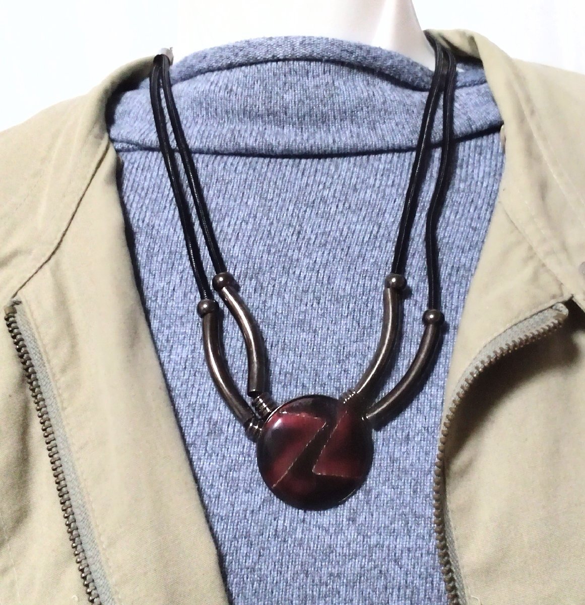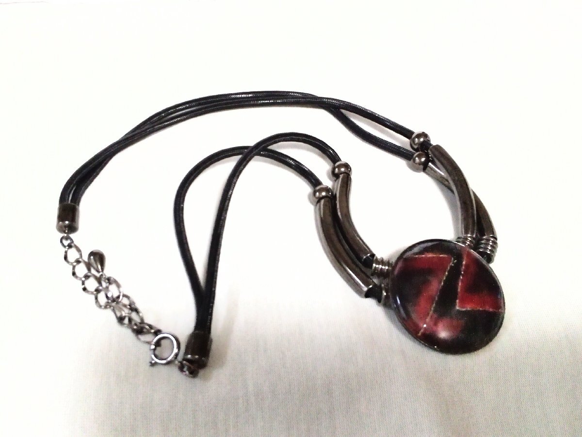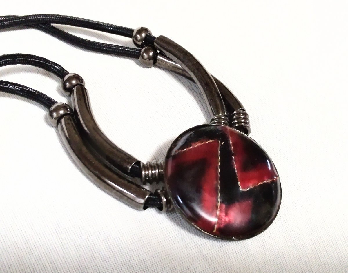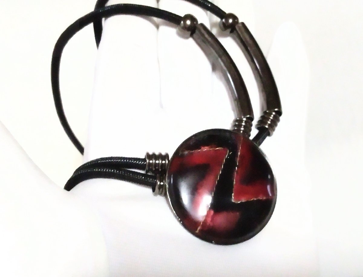 ★素材:銅版・銀箔・銅丸パイプ・銀線・黒レザー紐 ★メッキ・・黒メッキ ★七宝釉薬:釉薬・中赤・濃い赤紫 |