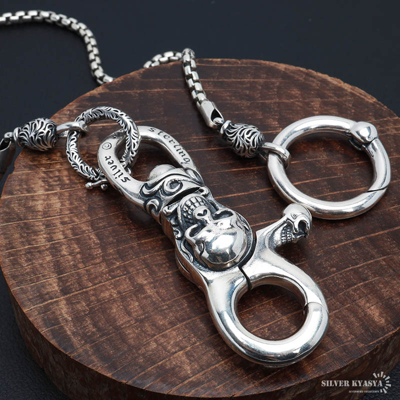 立体的なスカルクリップにベネチアンチェーンを繋げた重厚感抜群のウォレットチェーン。随所にあしらわれた唐草模様と燻し加工によりアンティークな雰囲気まとうアイテム。