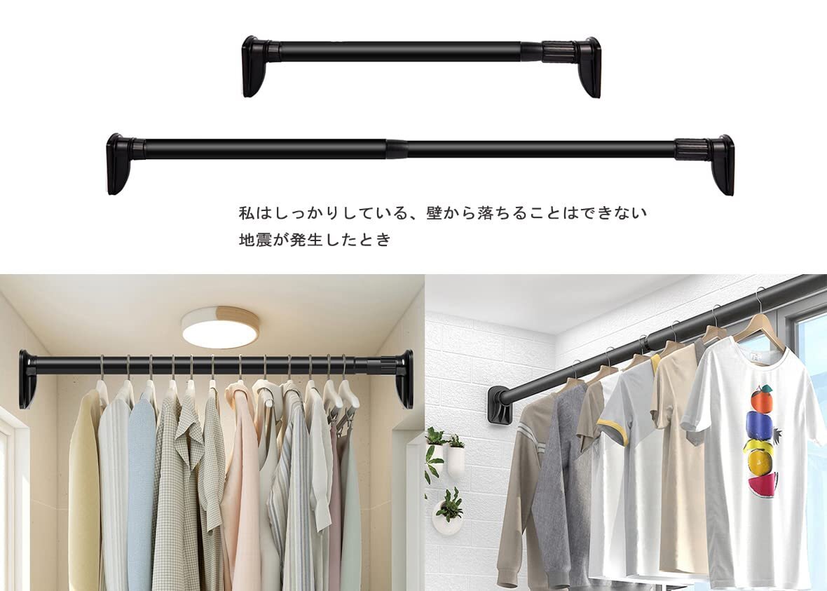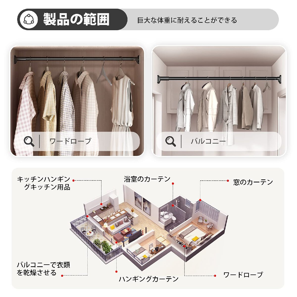 【多場所対応】つっぱり棒は自由に長さが調節でき、どこにでも設置でき、狭いスペースはもちろん、家の中のデッドスペースにも使えます。例えば:洗濯物を室内で干す、廊下でも部屋干し、ベランダの外に干す、つっぱり棒、クローゼットロッド、浴室用タオル掛け、室内用カーテンロッド、シャワーカーテンロッド、布団干し、(ご注意:商品を出荷するときに、両端のキャップは取り外し可能。改めて取り付けてもよろしいです。)