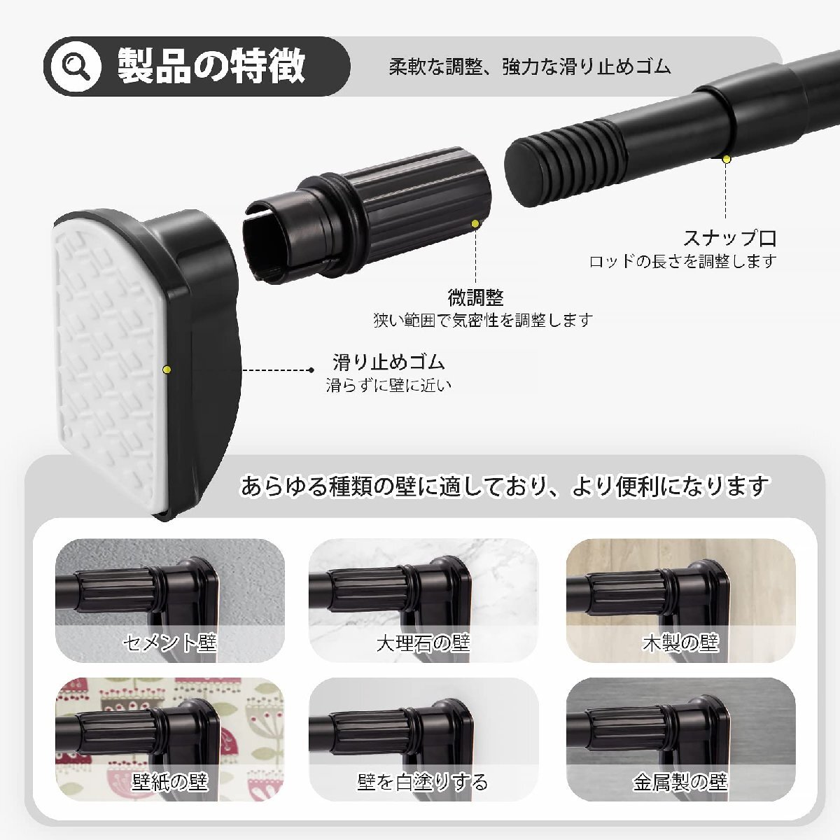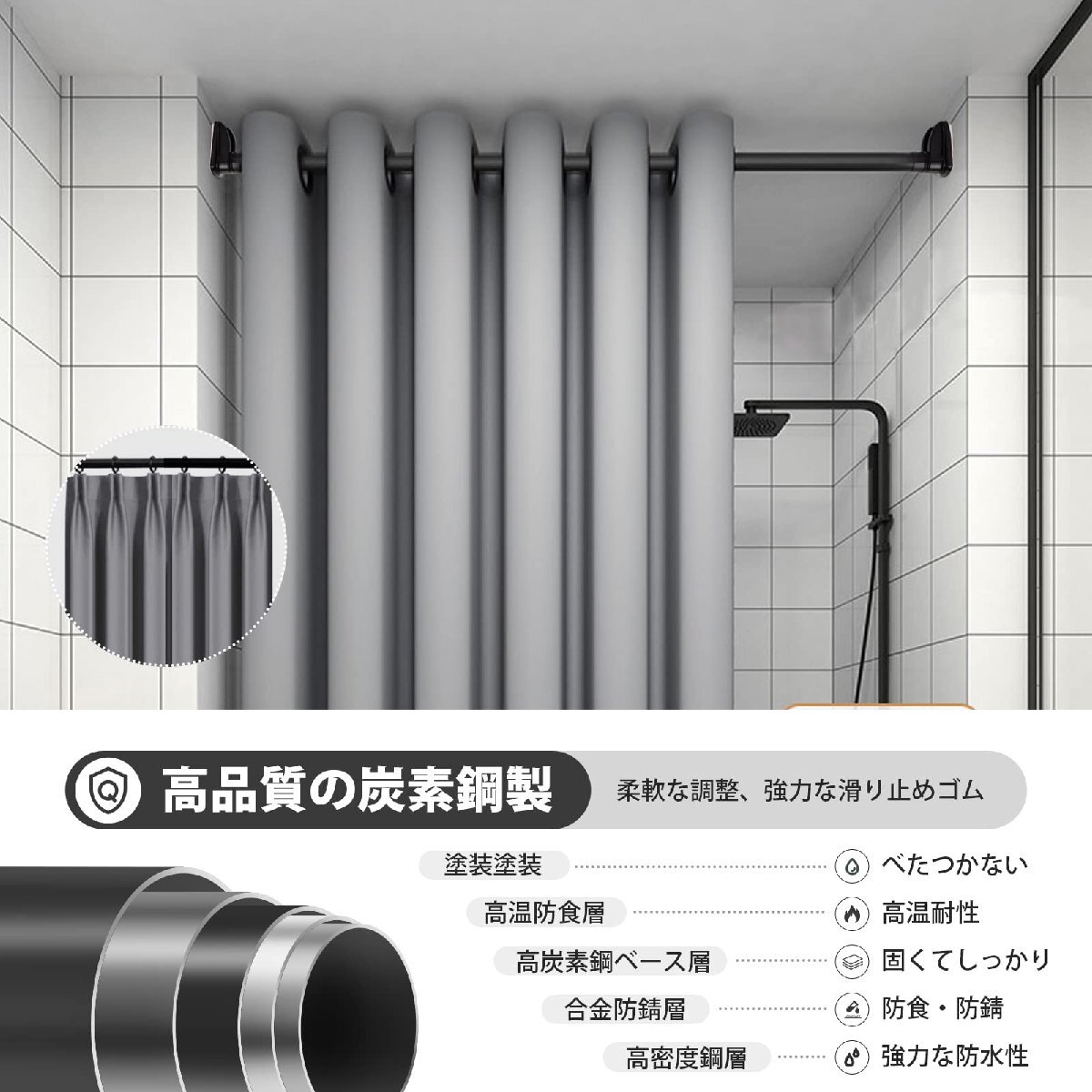 【高品質素材強力耐荷重】本社の突っ張り棒は、304ステンレスを採用した伸縮ロッドとABS樹脂を加工した圧着板を備えています。つっぱり棒強い負荷に耐えられます。耐荷重が約15~35kgです。突っ張り棒はサビに強い炭素鋼製のパイプを採用します。壁に接するキャップはABS材質を採用するので、湿気の多い浴室でもカビの発生を抑制します。