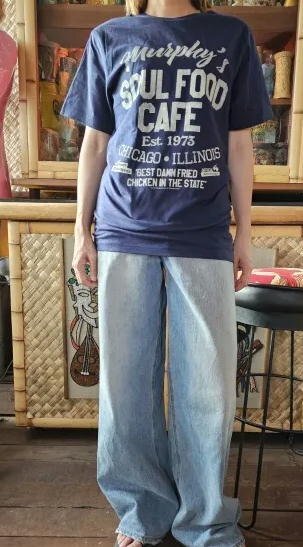 ジョン・ベルーシとダン・エイクロイド主演、ブルースやR&B、ソウルミュージックなどの黒人音楽に対するオマージュが込められたスラップスティックコメディ、「ブルースブラザース」のTシャツ「SOUL FOOD CAFE MENS LIGHTWEIGHT TEE」です。