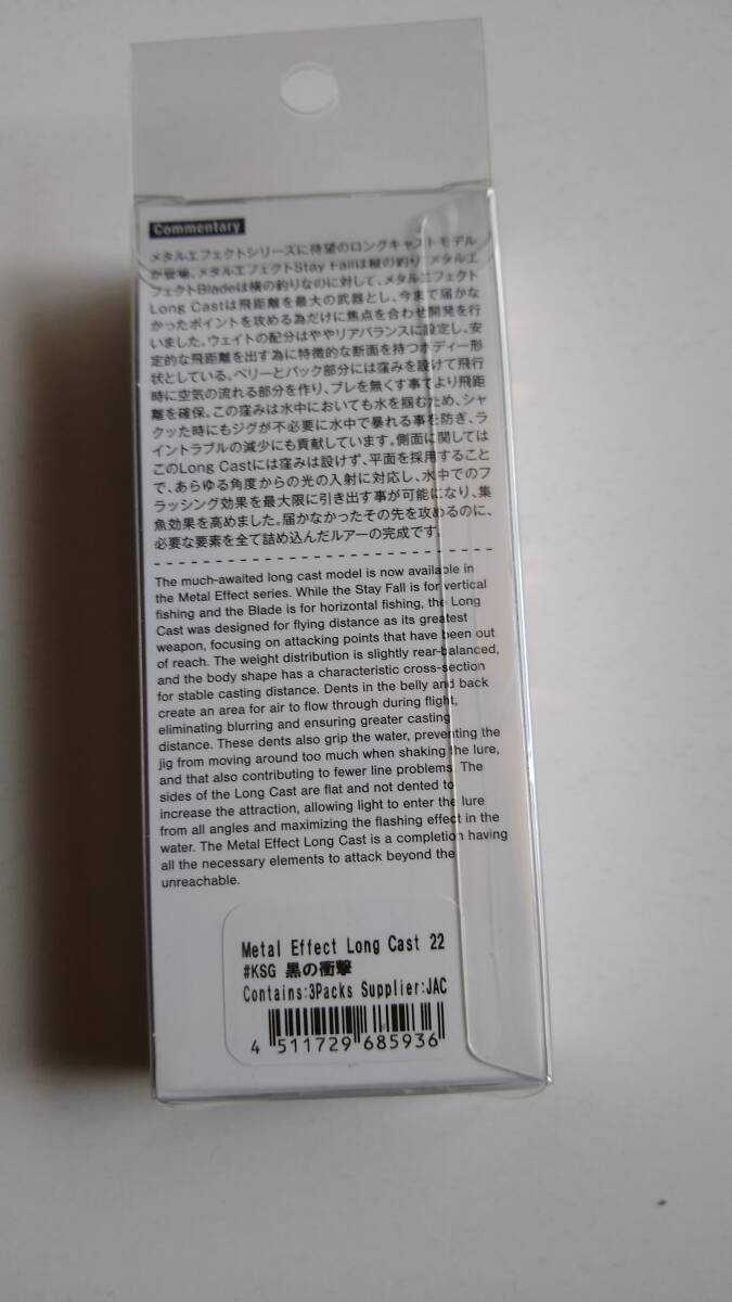 メタルエフェクトシリーズに待望のロングキャストモデルが登場。メタルエフェクトロングキャストは飛距離を最大の武器とし、今まで届かなかったポイントを攻める為だけに焦点を合わせ開発を行いなした。ウェイトの配分はややリアバランスに設定し、安定的な飛距離を出す為に特徴的な断面を持つボディー形状としている。ベリーとバック部分には窪みを設けて飛行時に空気の流れる部分を作り、ブレを無くす事でより飛距離を確保。この窪みは水中においても水を掴むため、シャクッた時にもジグが不必要に水中で暴れる事を防ぎ、ライントラブルの減少にも貢献しています。側面に関してはこのロングキャストには窪みは設けず、平面を採用することで、あらゆる角度からの光の入射に対応し、水中でのフラッシング効果を最大限に引き出す事が可能になり、集魚効果を高めました。届かなかったその先を攻めるのに、必要な要素を全て詰め込んだルアーの完成です。
