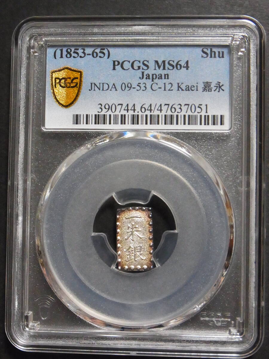 商品名:嘉永一朱銀(1853~1865) 三ッ跳・座 位付1位 PCGS MS64 未使用 の出品です。