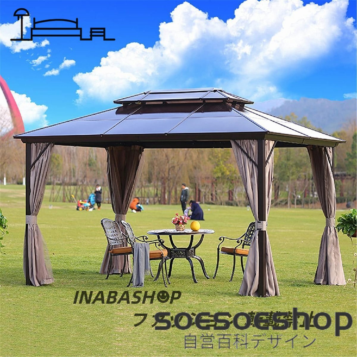 屋外ダブルルーフハードトップガゼボ、裏庭、庭用のメッシュカーテン側壁付きアルミニウム家具パーゴラガーデンシェルター