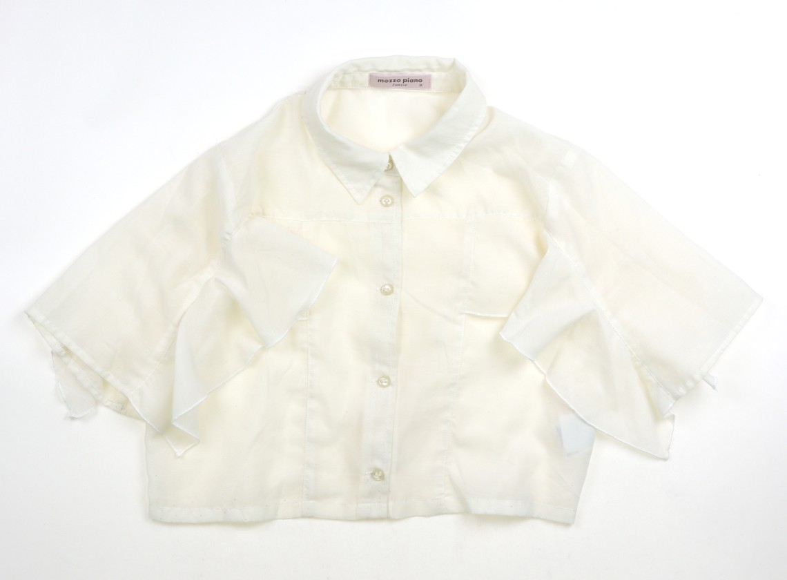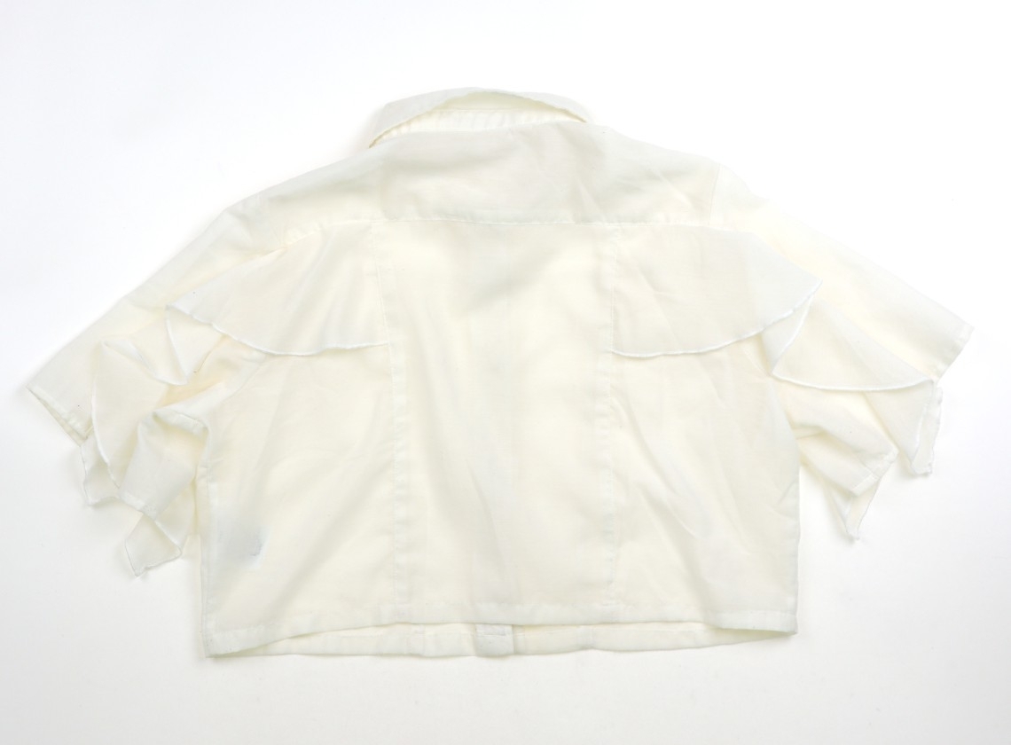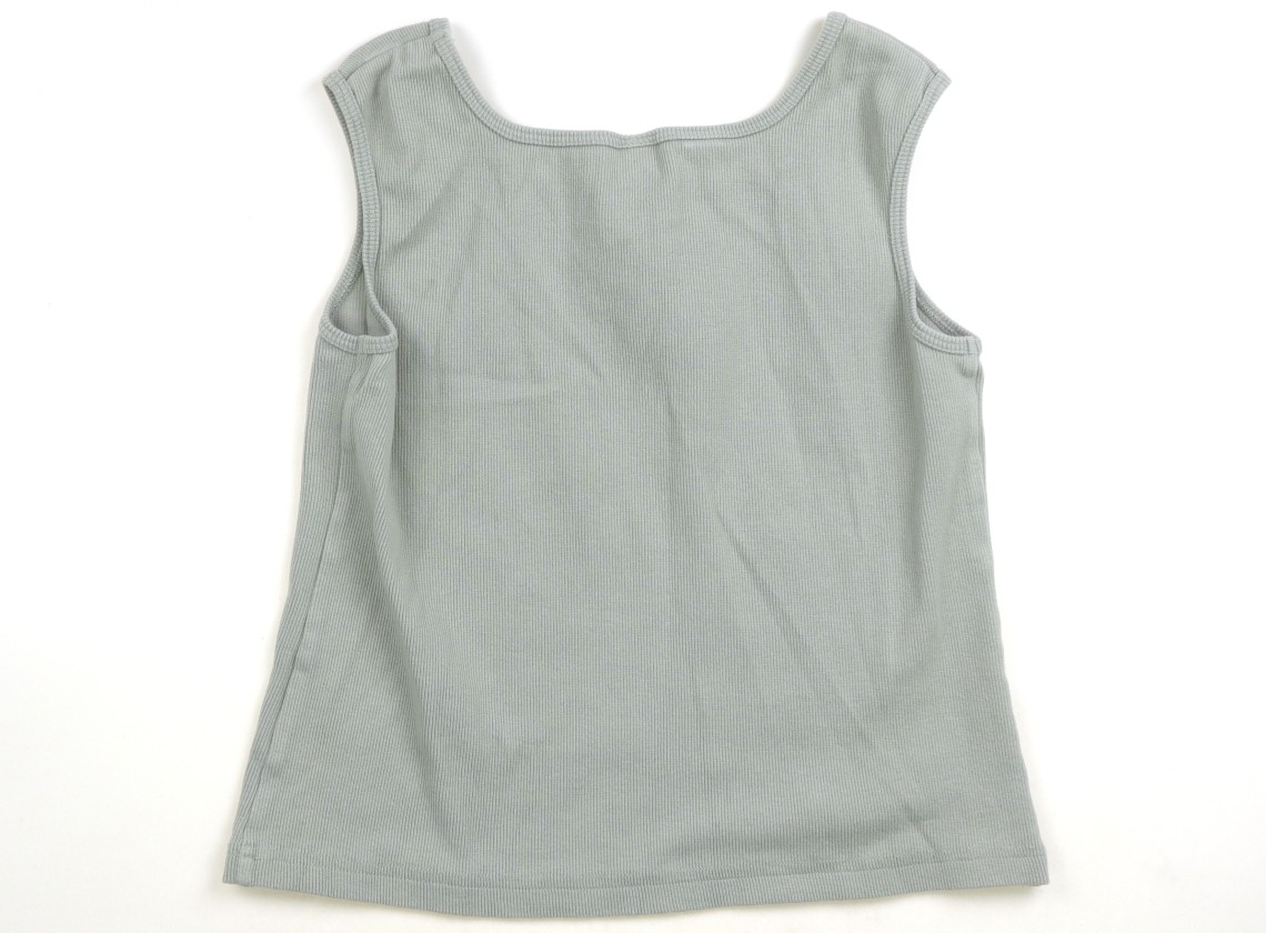 透け感のあるポリエステル100%のシャツと綿・ポリウレタンのリブタンクトップのセットです。シャツは裾まわりにグレーの毛玉あり。腹部に茶色い点シミ複数あり。タンクトップは毛羽立ちと色褪せが強いです。
