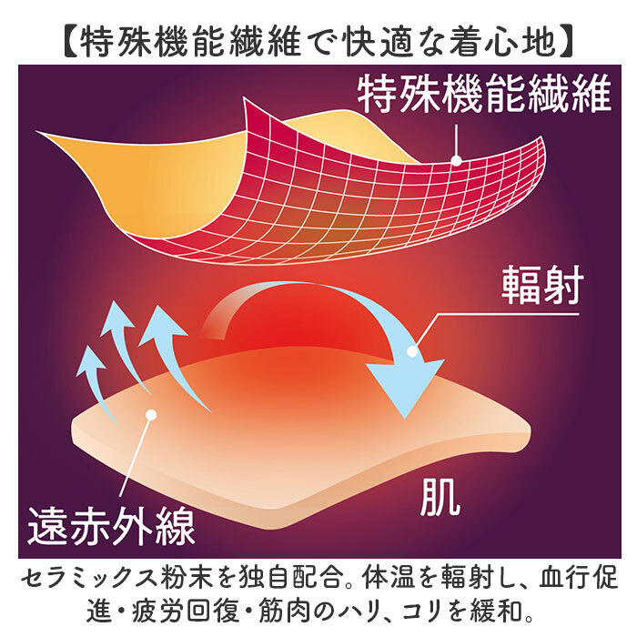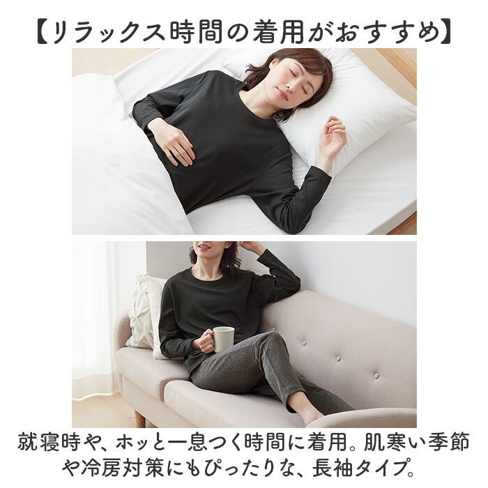 商品説明 | ・・【お休みタイムに疲れをリカバリー】 ・着る疲労回復◎アクティブな毎日へ!「リカバリーケアレディース長袖シャツ」。 ・【特殊機能繊維で快適な着心地】 ・セラミックス粉末を独自配合。体温を輻射し、血行促進・疲労回復・筋肉のハリ、コリを緩和。 ・【サラリとした質感でストレスフリー】 ・肌当たりが優しい、ポリエステル&コットン混紡素材。チクチク感もなく、睡眠を妨げない◎ ・【リラックス時間の着用がおすすめ】 ・就寝時や、ホッと一息つく時間に着用。肌寒い季節や冷房対策にもぴったりな、長袖タイプ。 ・【着こなしやすいクルーネック】 ・胸元をガードしつつ、首元が詰まりすぎないネックデザイン。 ・【機能面はそのままに、丸洗いOK】 ・ネットに入れて、洗濯機洗い可能。洗濯しても機能はそのまま、いつも清潔をキープ。 ・(※)洗濯機の弱モードをご使用ください。繊維自体に練り込まれているため、繰り返し洗濯しても機能を発揮します。 ・【頑張っている方へのギフトにも】 ・忙しい時こそ、しっかり休息が必要◎心地よい睡眠をサポートし、目覚めもすっきり。 |