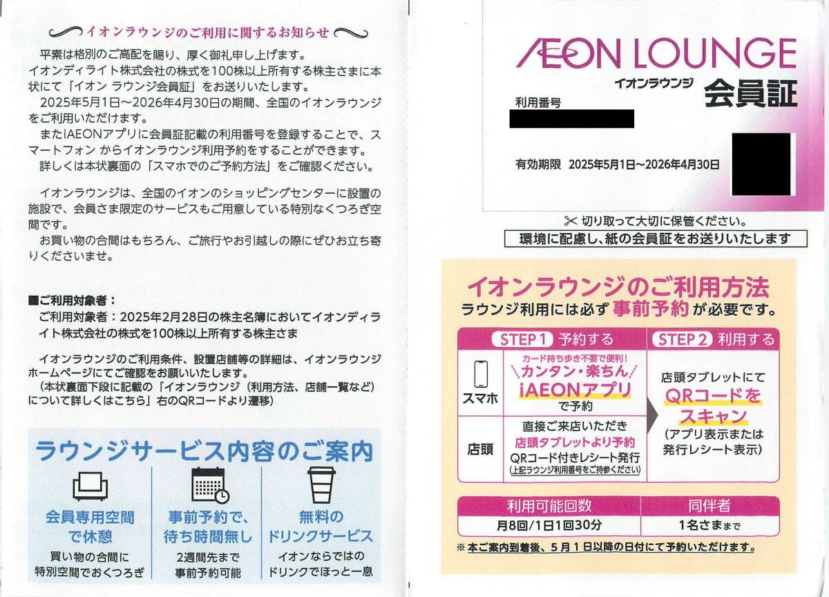 最新2026.4.30迄 イオンラウンジ 会員証 イオンディライト 株主優待 ドリンク無料等 男性名義