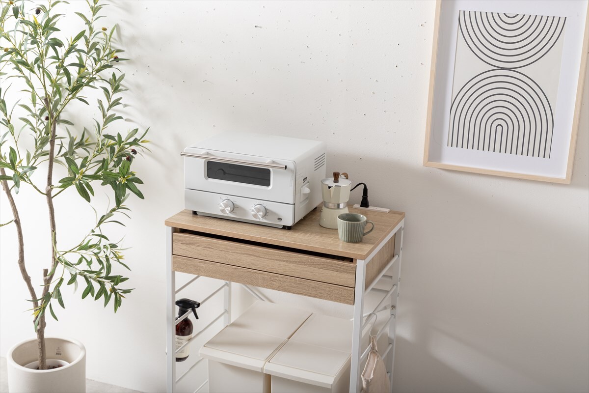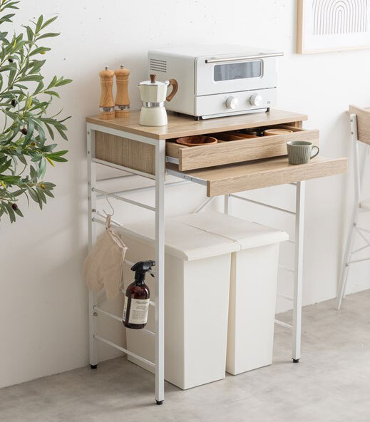 ゴミ箱上のデッドスペースを収納・作業スペースとして有効的に活用する『Cammy(キャミー)』ゴミ箱上レンジラック。