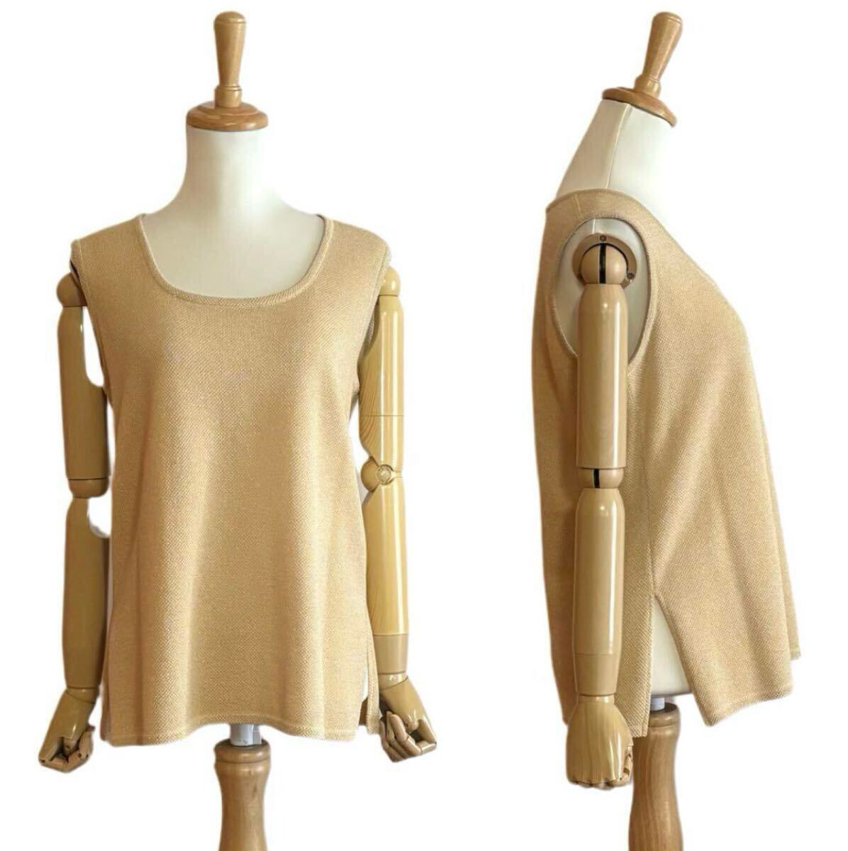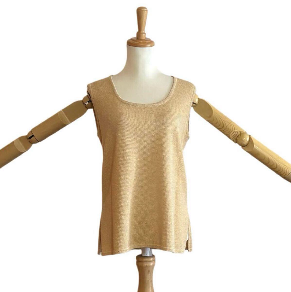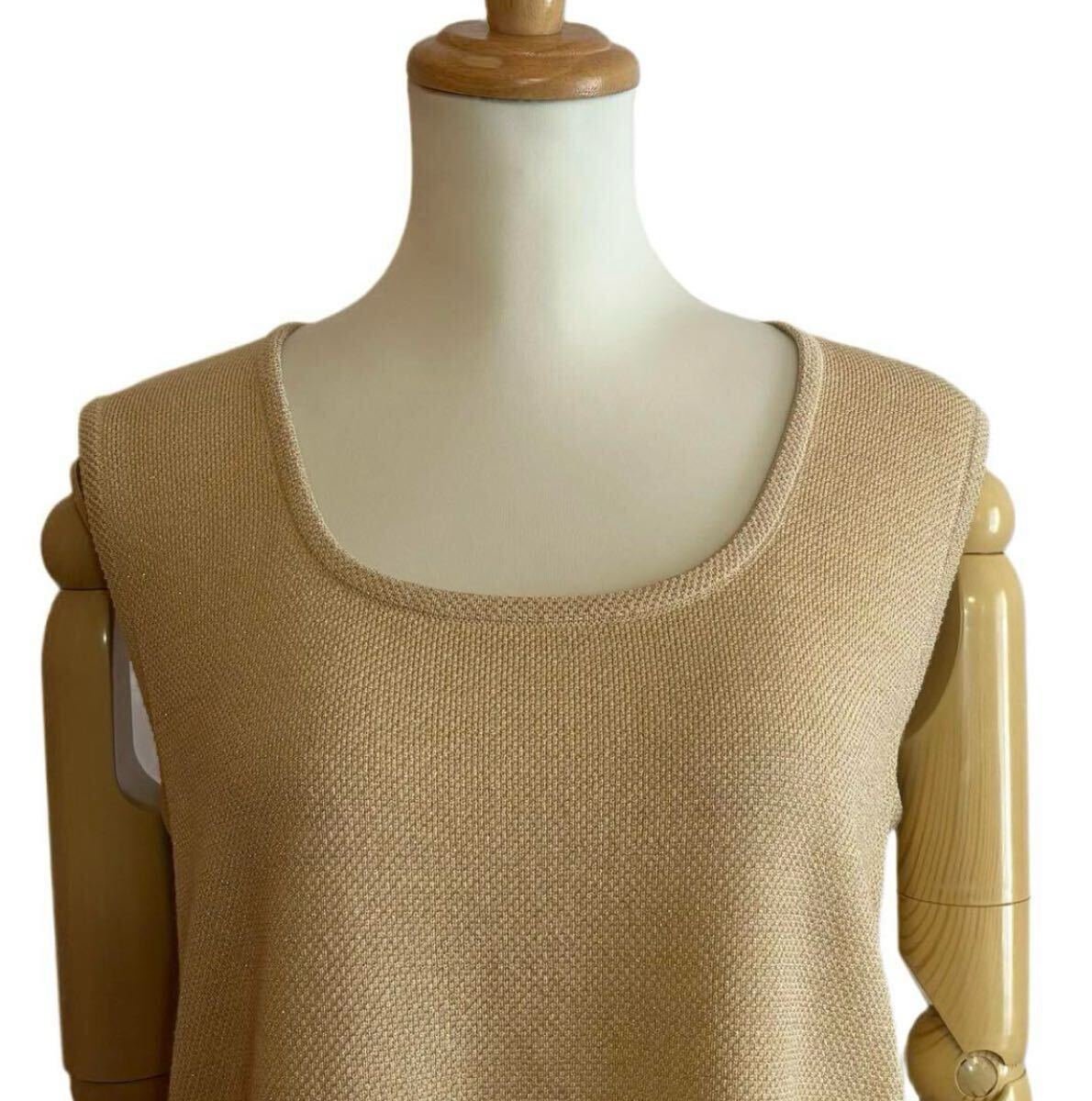 柔らかな淡いイエローベースに、さりげなくきらめくゴールドラメ糸を織り込んだ、華やかさと上品さを兼ね備えたニットベストです。