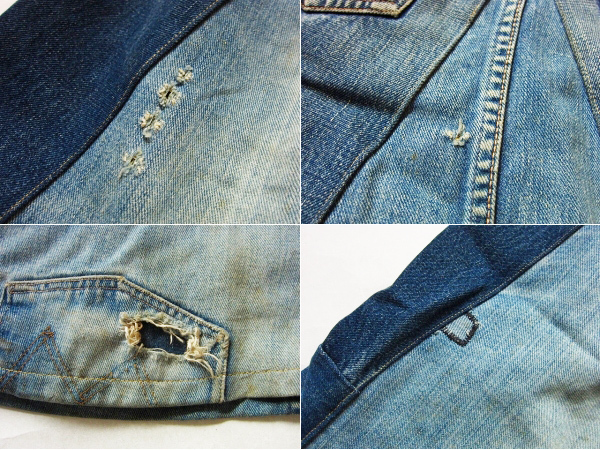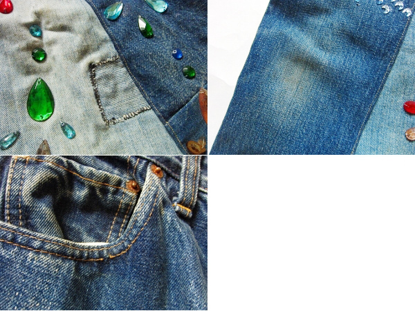全体の状態 | リペアが施されているところや傷、穴、汚れ、デザインの縫い付けステッチが切れて石が外れているところなどもあります。 使用感はありますが、まだまだ着用いただけます。 |