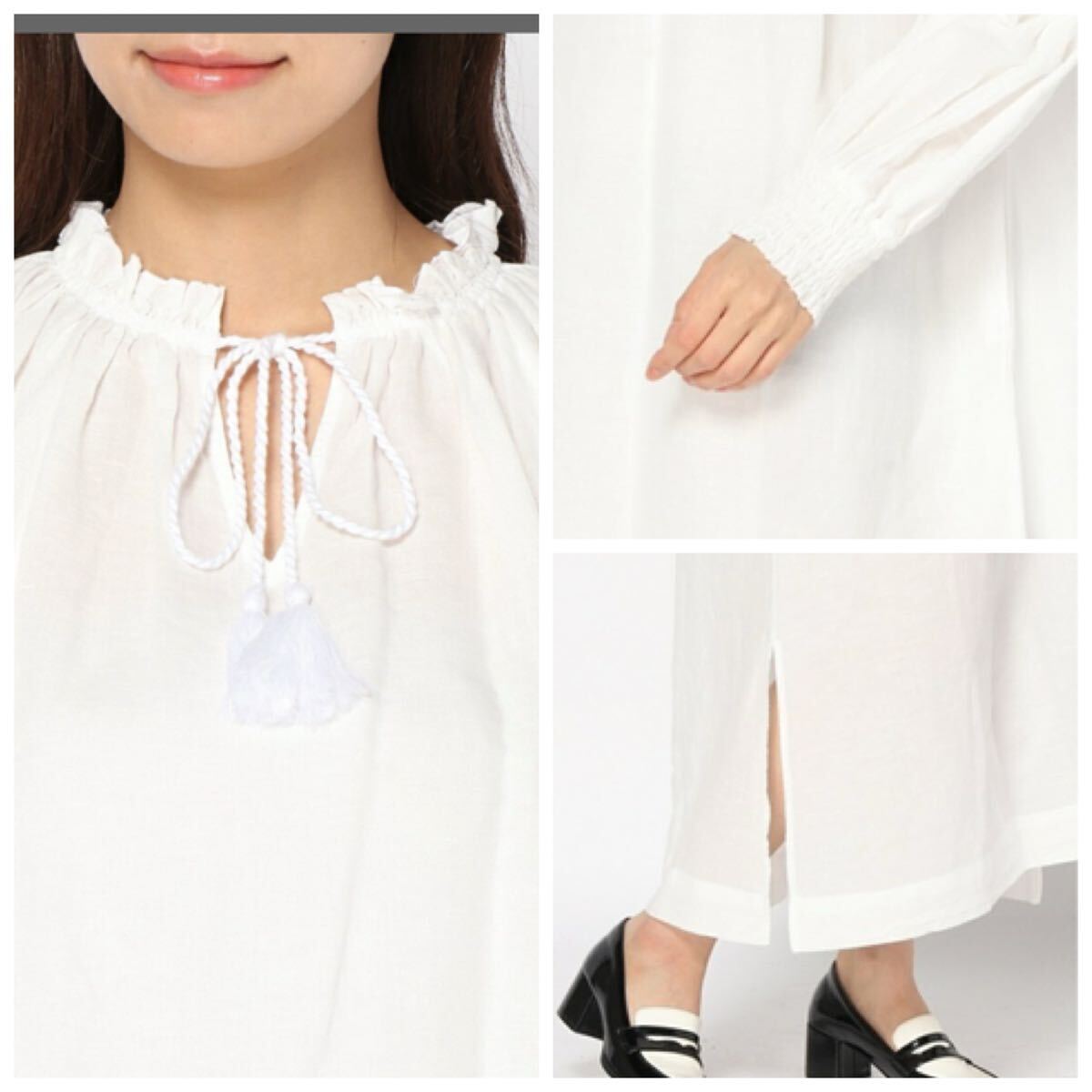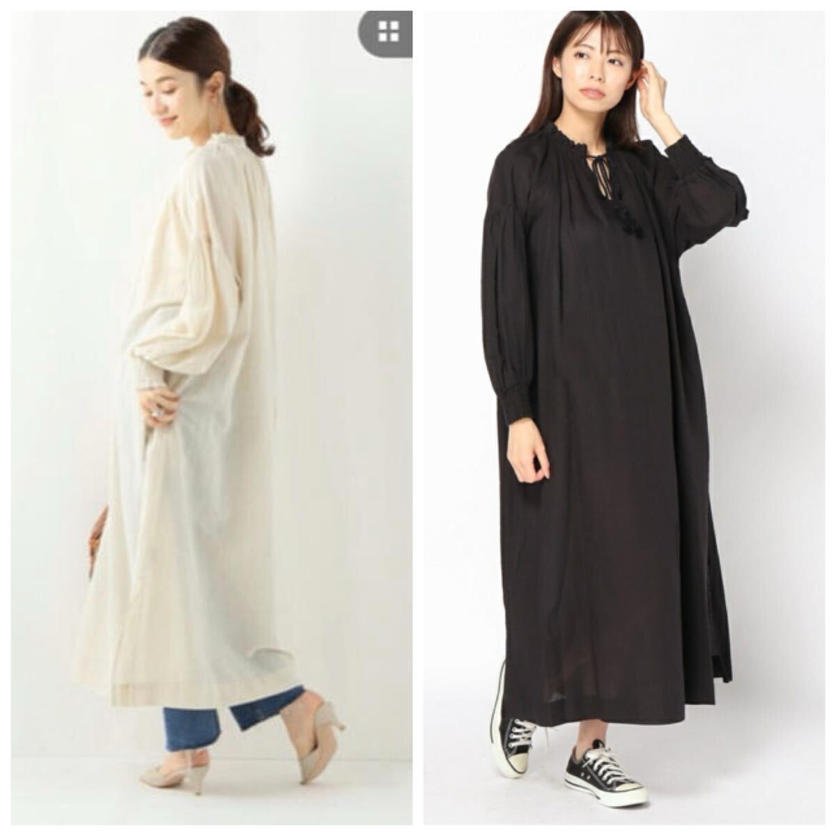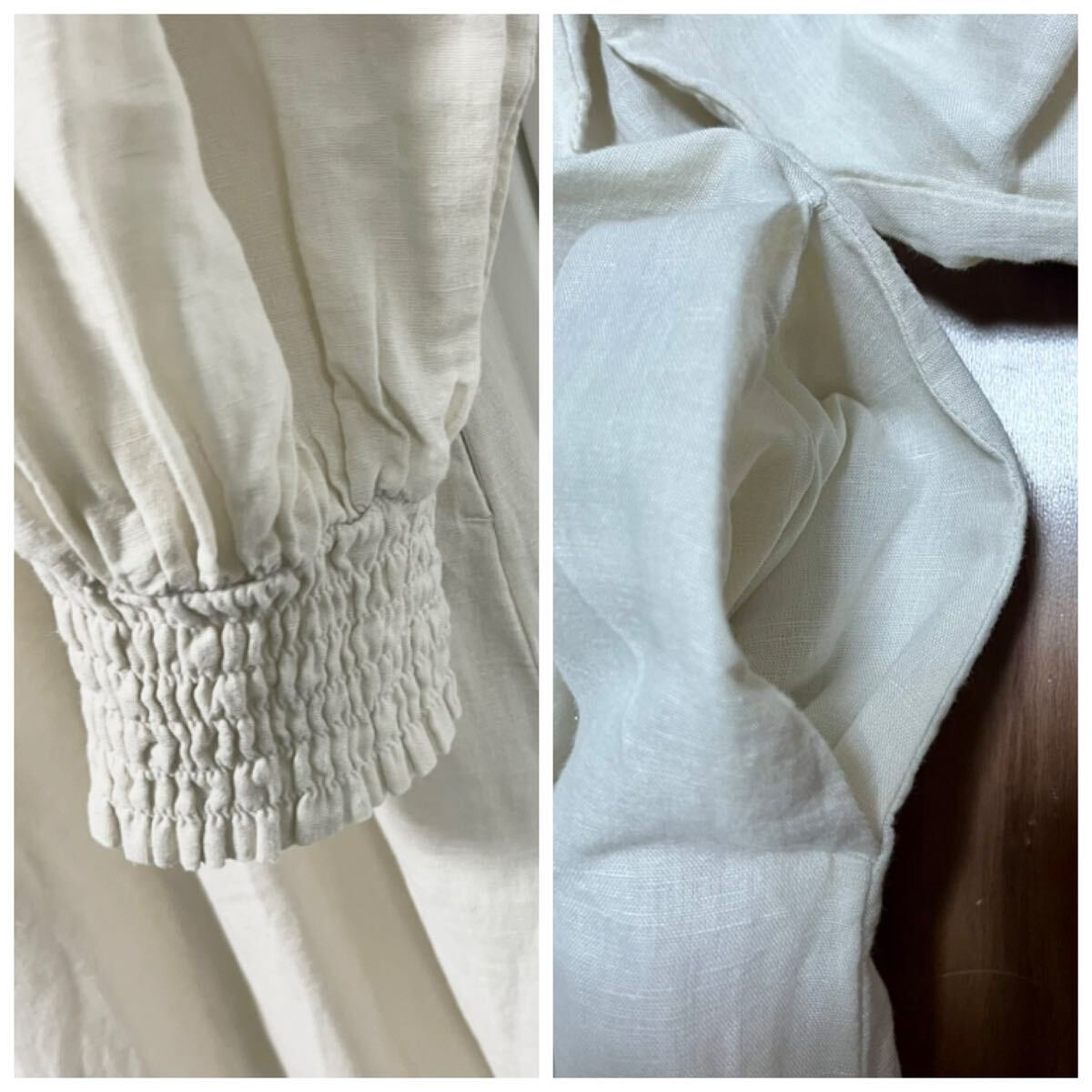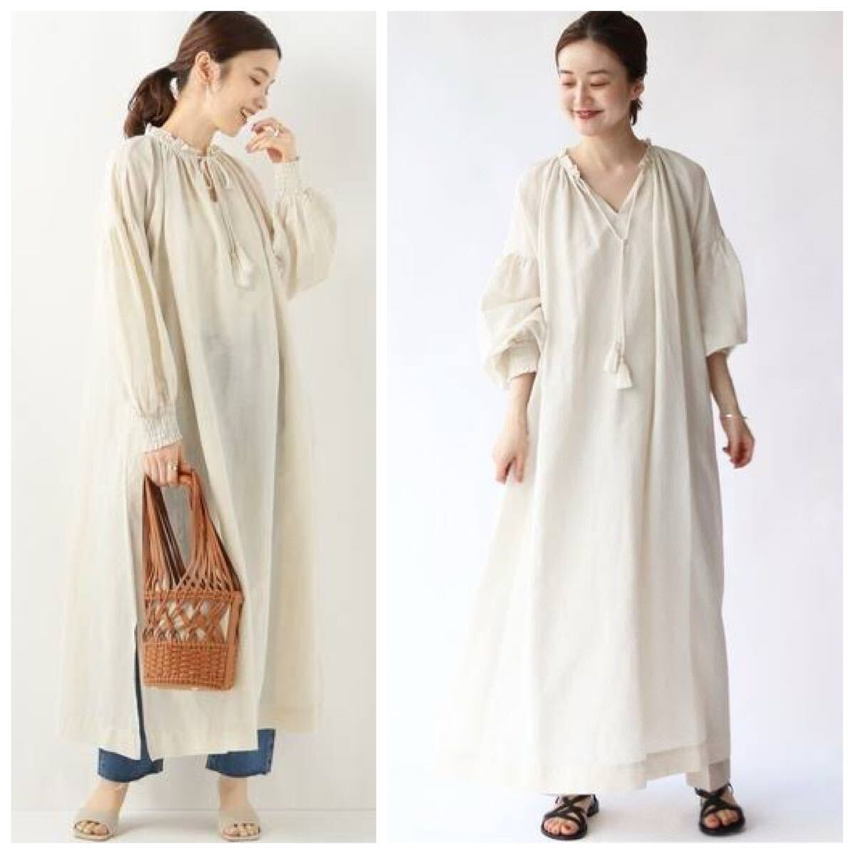 【スタッフ着用コメント】《スタッフA》年齢:20代後半/身長:156cm/体型:普通/普段サイズ:M/着用サイズ:38サイズ感:袖はゴムで丁度手首で止まります。着丈はフラットシューズで地面に着くかつかないか程度。素材感:コットンリネンで透け感は若干ありつつも、しっかりとした素材です。着用感:ゆるやかにAラインになるリラックス感のあるシルエット。スリットも深めに入っているので、長めの着丈でも軽やかに着れます。