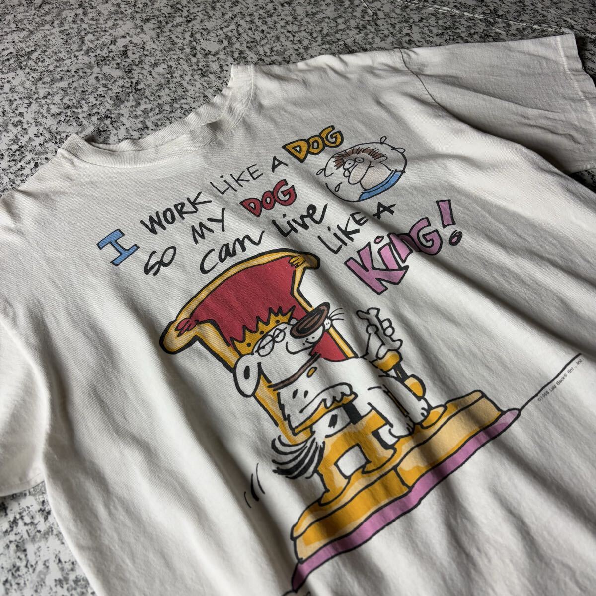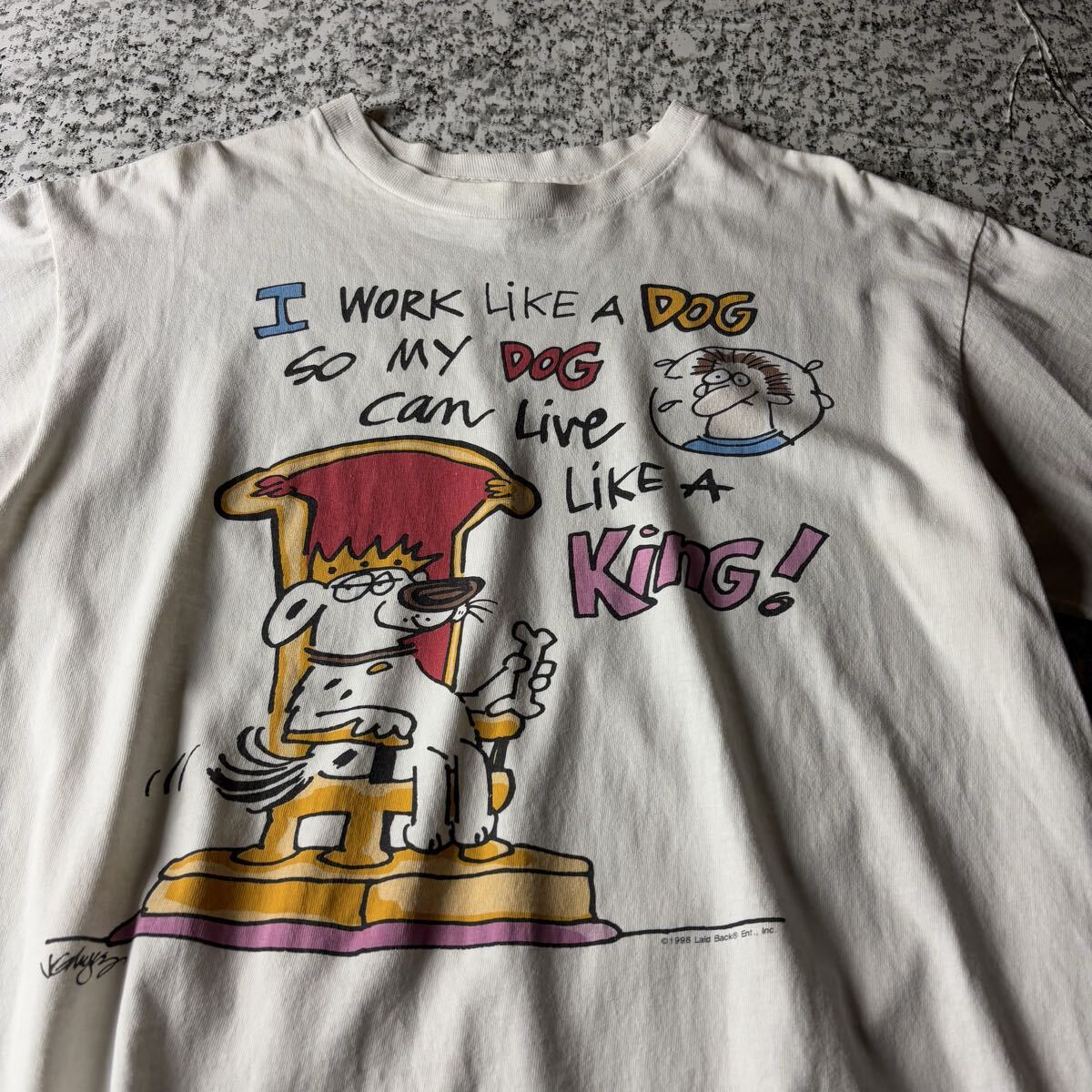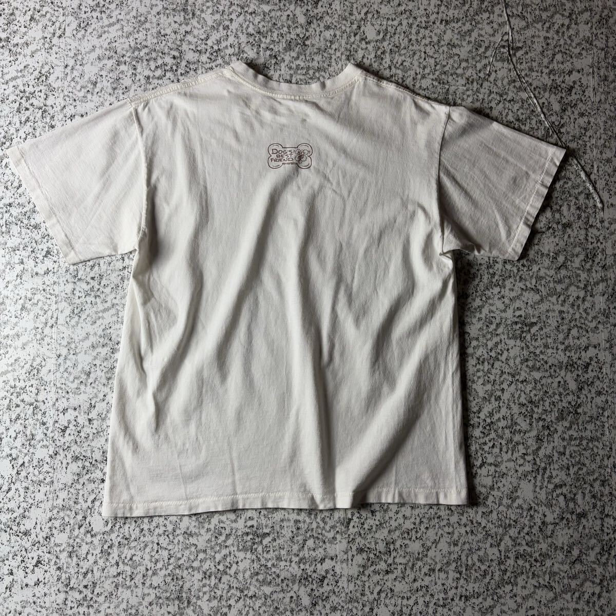 【90sオールド】イヌ イラスト メッセージ シングルステッチ ヴィンテージT ホワイト Lサイズ 古着  半袖 Tシャツ キャラクター