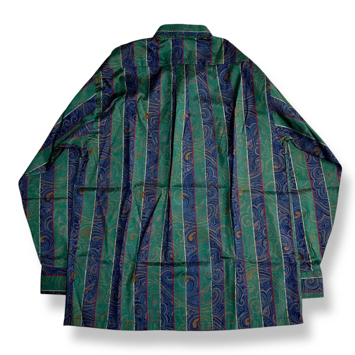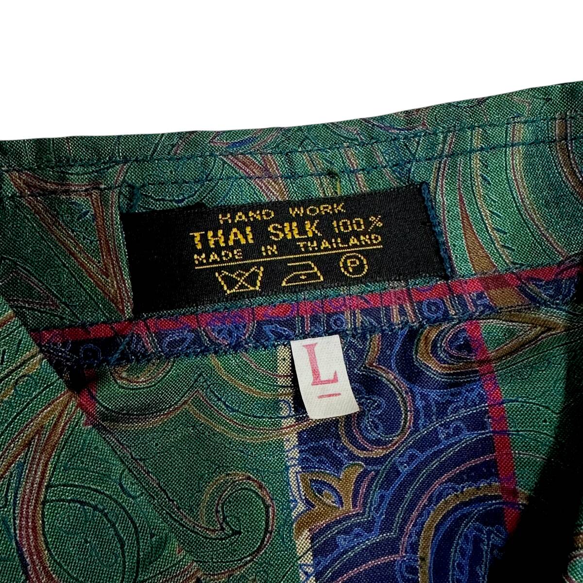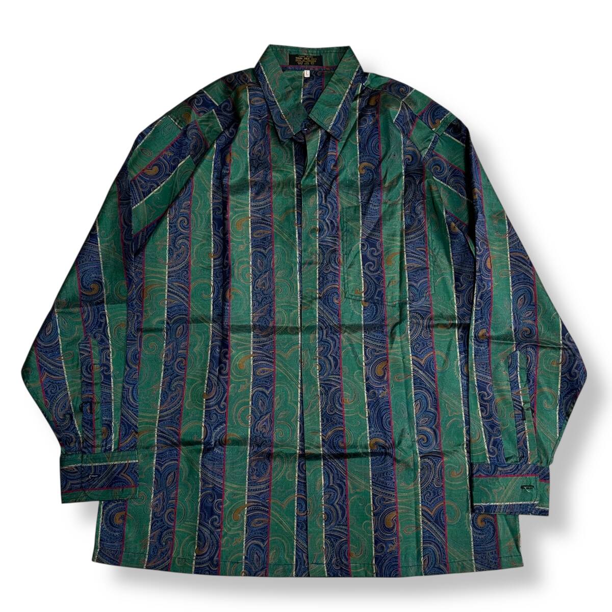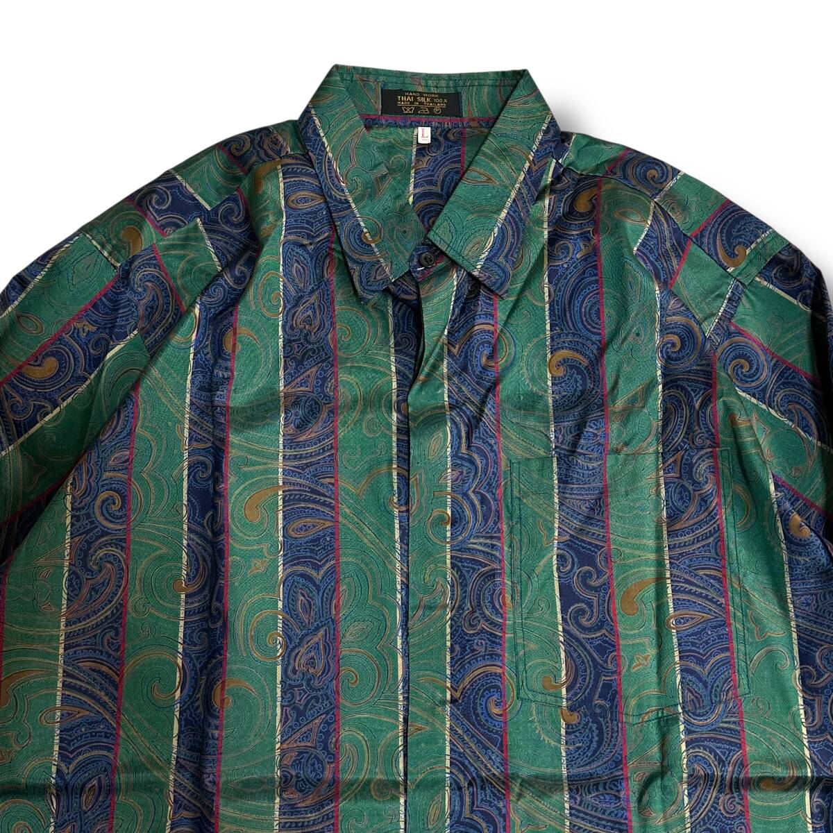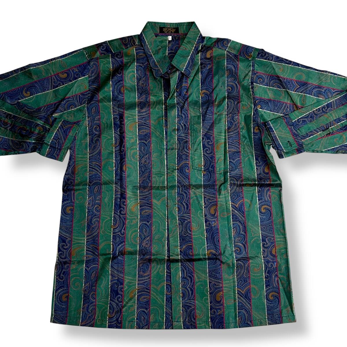 希少 美品【THAI SILK】高級 タイシルク100% 総柄 伝統衣装 ストライプ BATIK SILK 長袖シャツ グリーン/ネイビー タイ製
