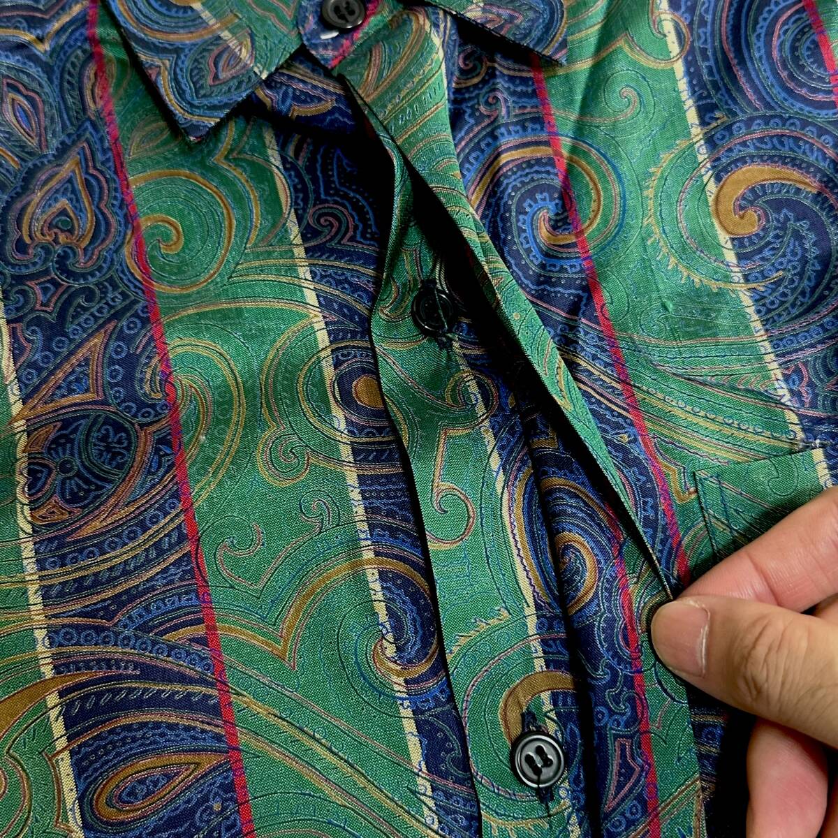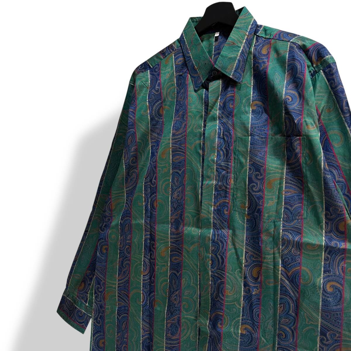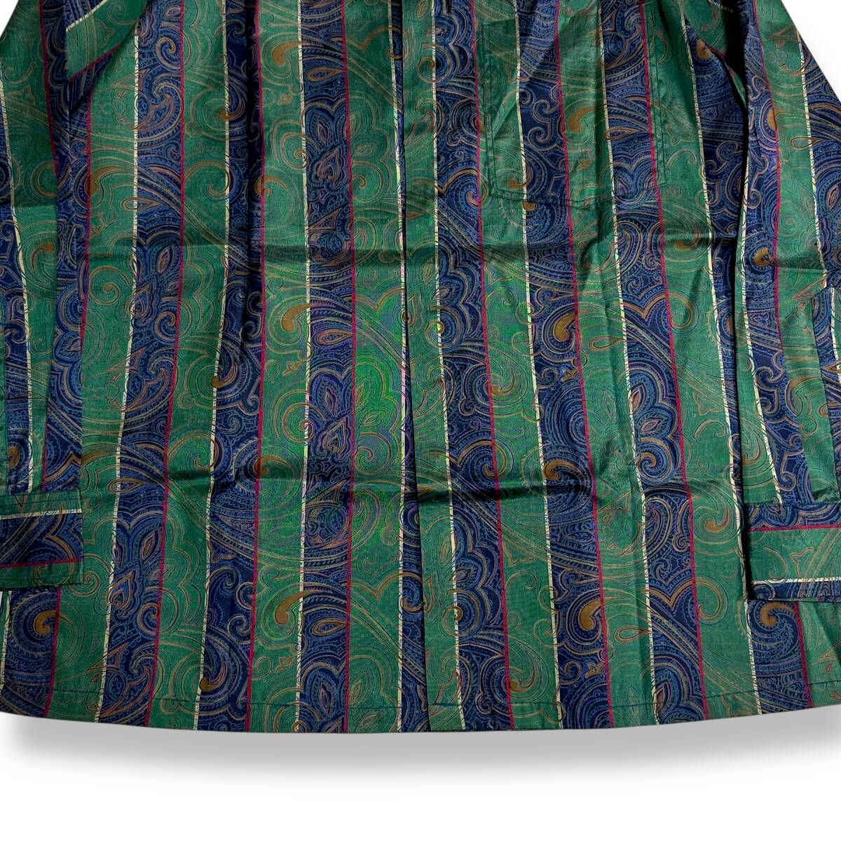 ラインパターンでペイズリーに近い感じのデザイン、グリーンとネイビーのカラートーンととても存在感もあり他とは被らない秀逸な1着