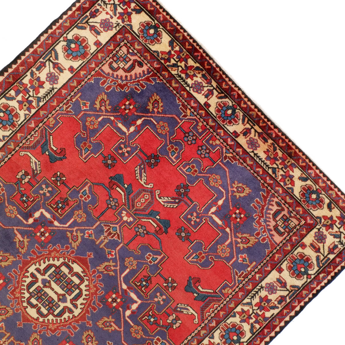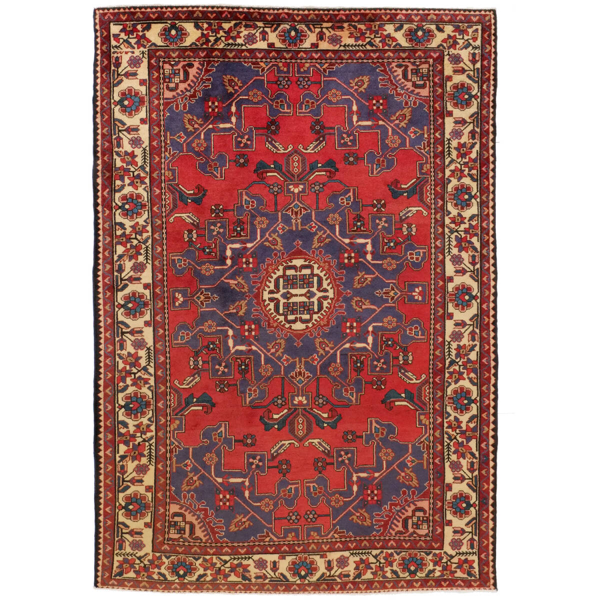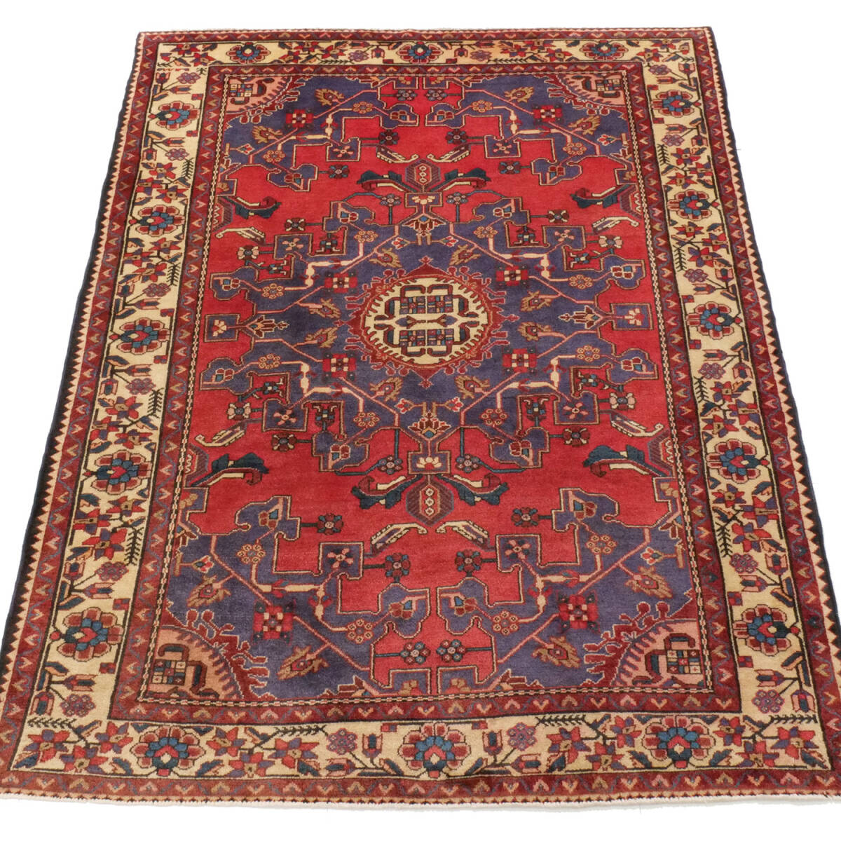 1940年代にハマダンで制作された、クラシカルな印象を持つアンティーク絨毯です。中央に整ったメダリオンが据えられ、フィールドには繊細なヘラティ文様が繰り返し配されています。