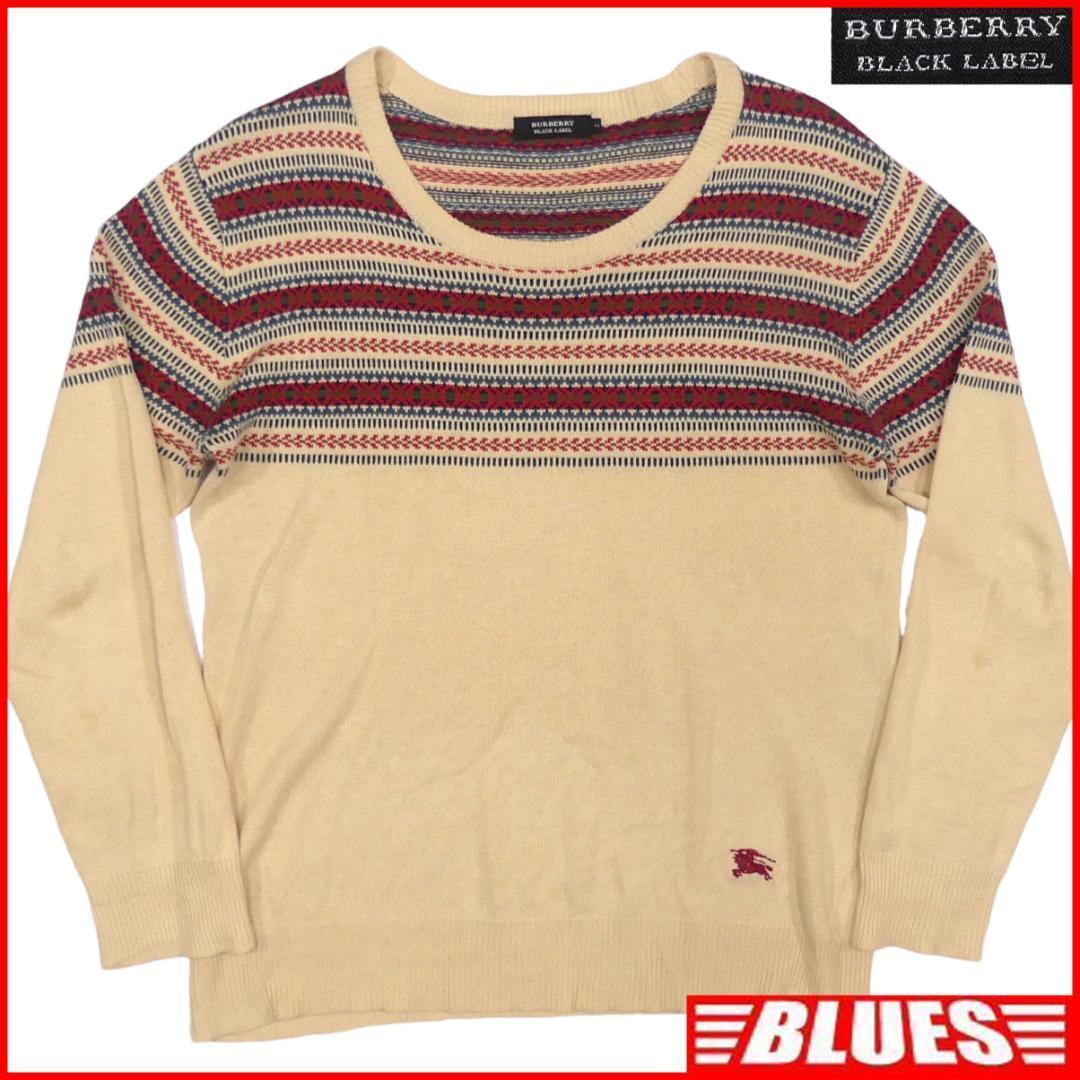 即決★BURBERRY BLACK LABEL★メンズM 廃版 ニット セーター バーバリーブラックレーベル 2 ベージュ リネン ボーダー 刺繍