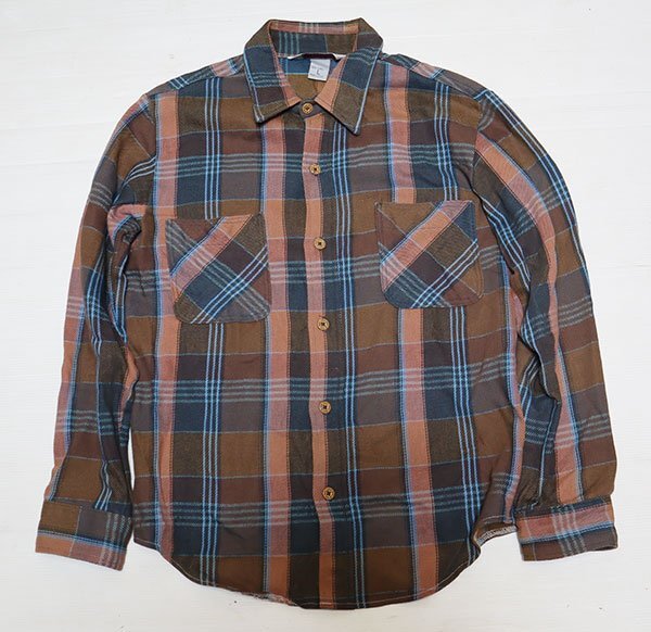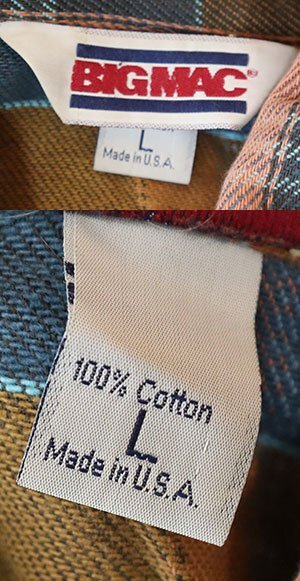 80-90年代頃の三角タグのアメリカ製BIGMACの青系X暗いオレンジ系他の織りチェックネルシャツです。