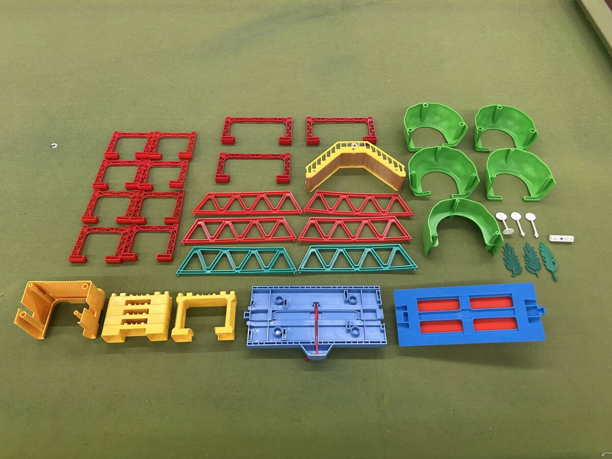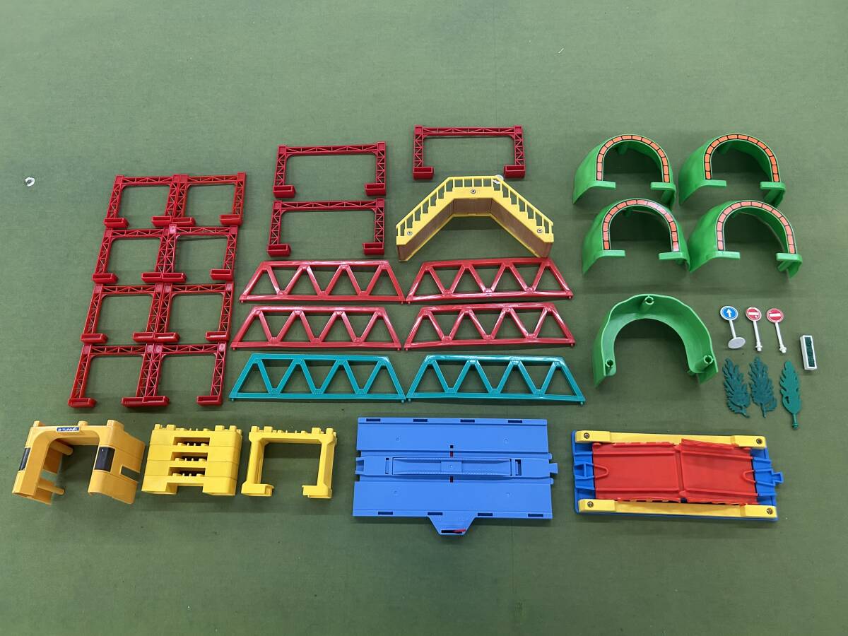 ■架線柱、鉄橋、橋脚、ブロック橋脚、トンネル、山のトンネル、はね橋、BRIO 橋、トミカタウン ミニチュア木、道路標識、樹木等 です。(素人検品の為、名称間違いあるかも知れません)
