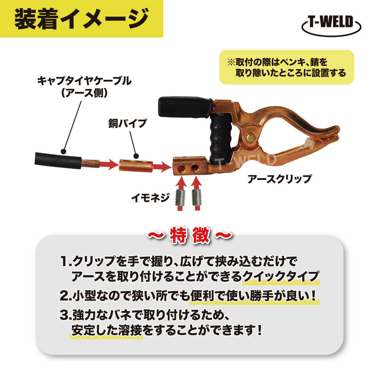 1.クリップを手で握り、広げて挟み込むだけでアースを取り付けることができるクイックタイプになります!