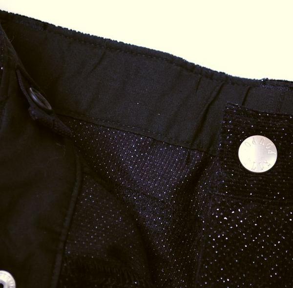 ウェストはゴムアジャスターでサイズ調節可能で、前ファスナー開きロゴのマットボタンは飾りです。