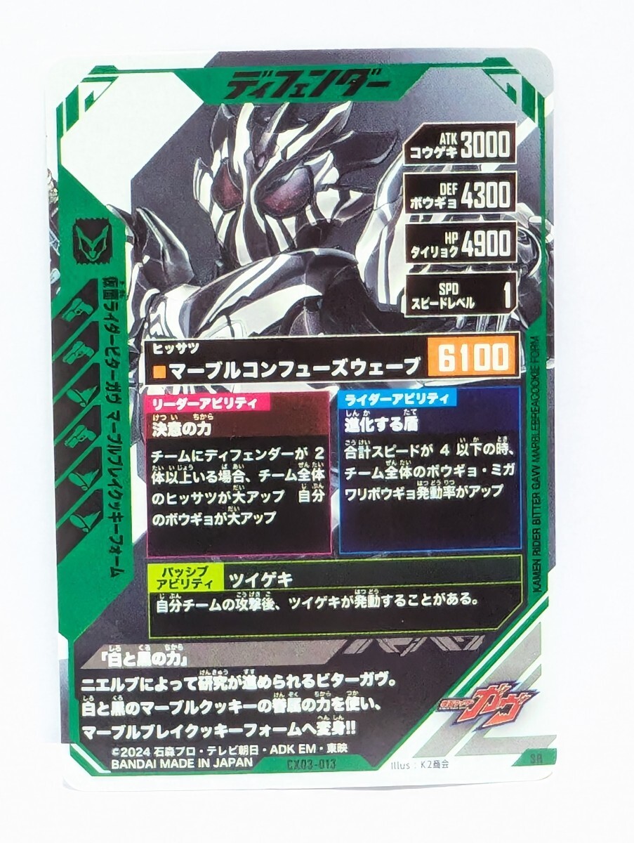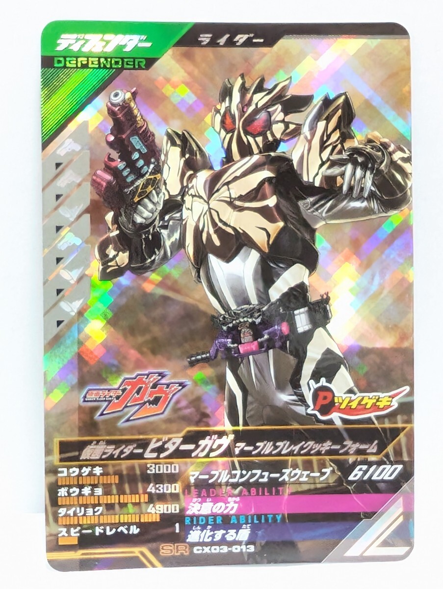 「仮面ライダーバトル ガンバレジェンズCX3弾 仮面ライダービターガヴ マーブルブレイクッキーフォーム(SR CX03-013) ガヴ ツイゲキ」を出品します。「おまとめ」可能な方は4枚までミニレター送料85円でお取扱いできます。5枚以上の場合は定形郵便で送料別途計算となります。