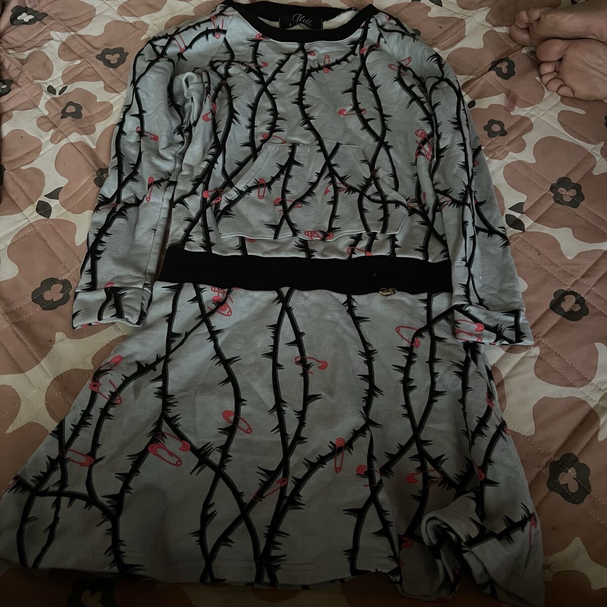 MILKのスウェット素材のワンピースです。パーカーのようにカンガルーポケットが付いています。凝った作りでかわいいです。