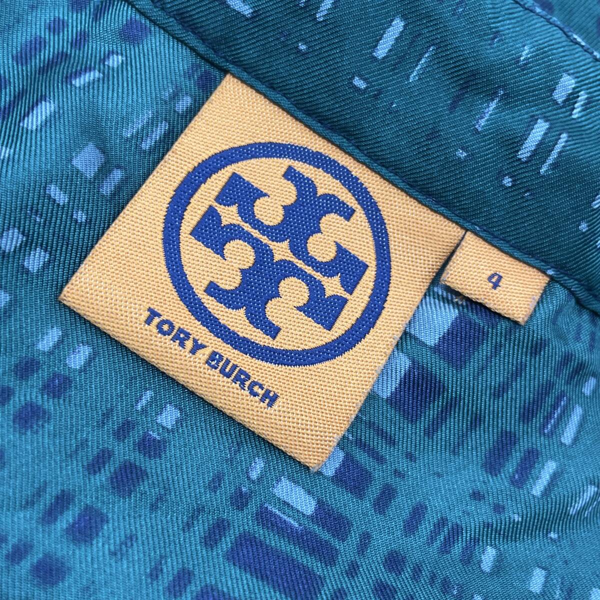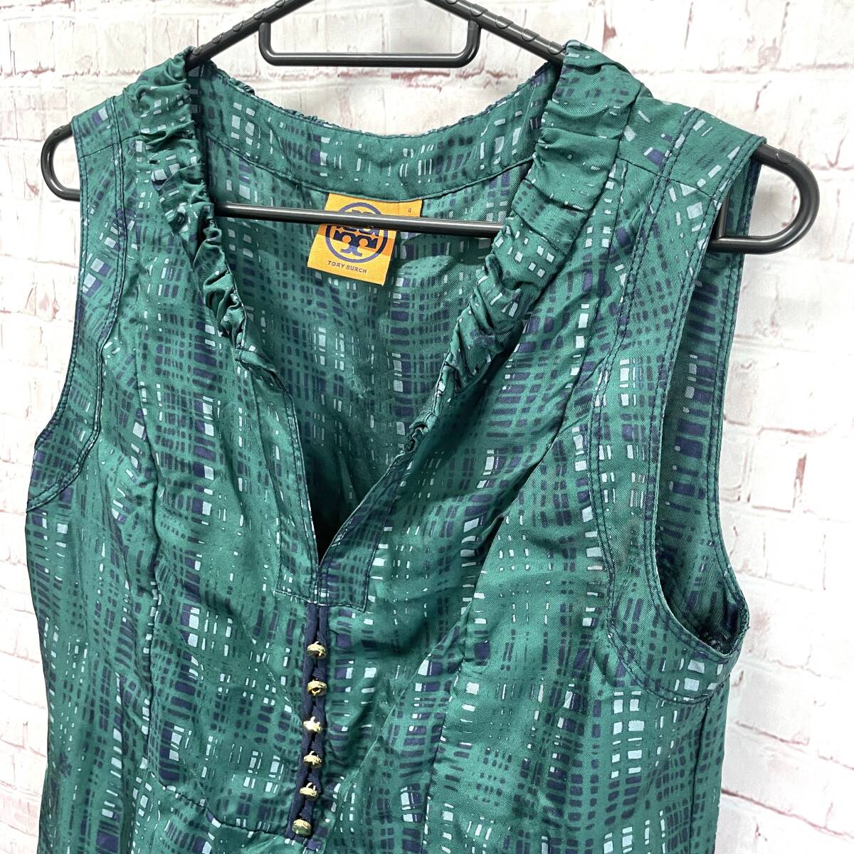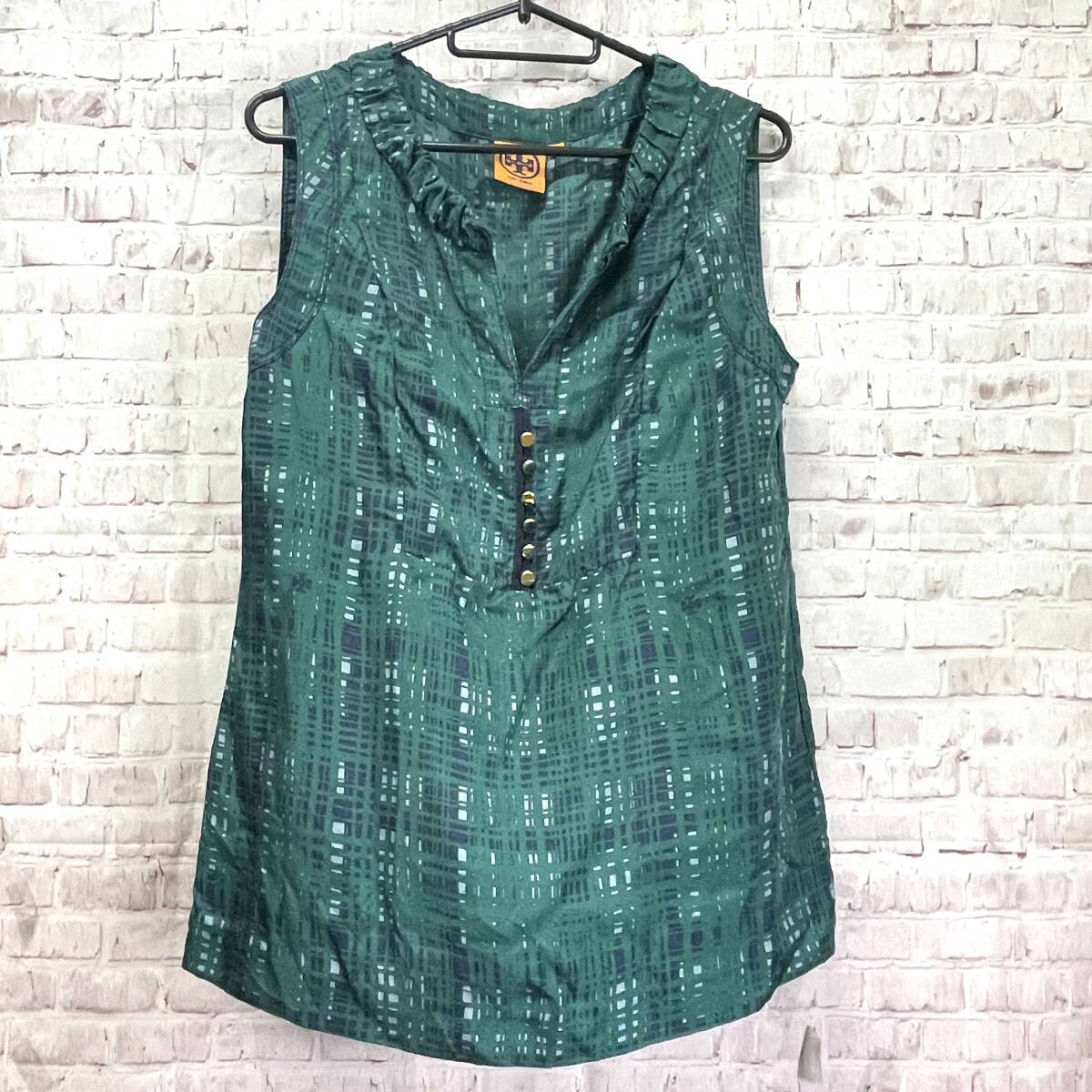 TORY BURCH トリーバーチ ノースリーブ ブラウス Vネック シルク グリーン×ネイビー チェック柄 ロゴプリント ゴールド金具