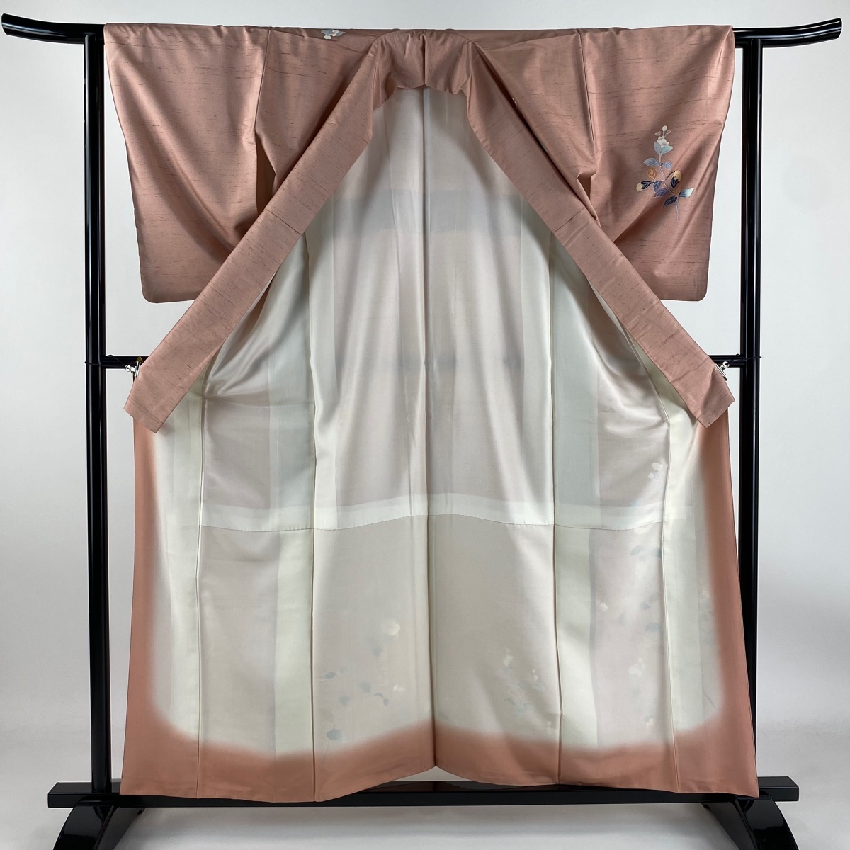 | 訪問着 美品 秀品 落款 紬地 椿 草花 ピンクベージュ 袷 身丈158.5 裄丈62 S 正絹 【中古】 |