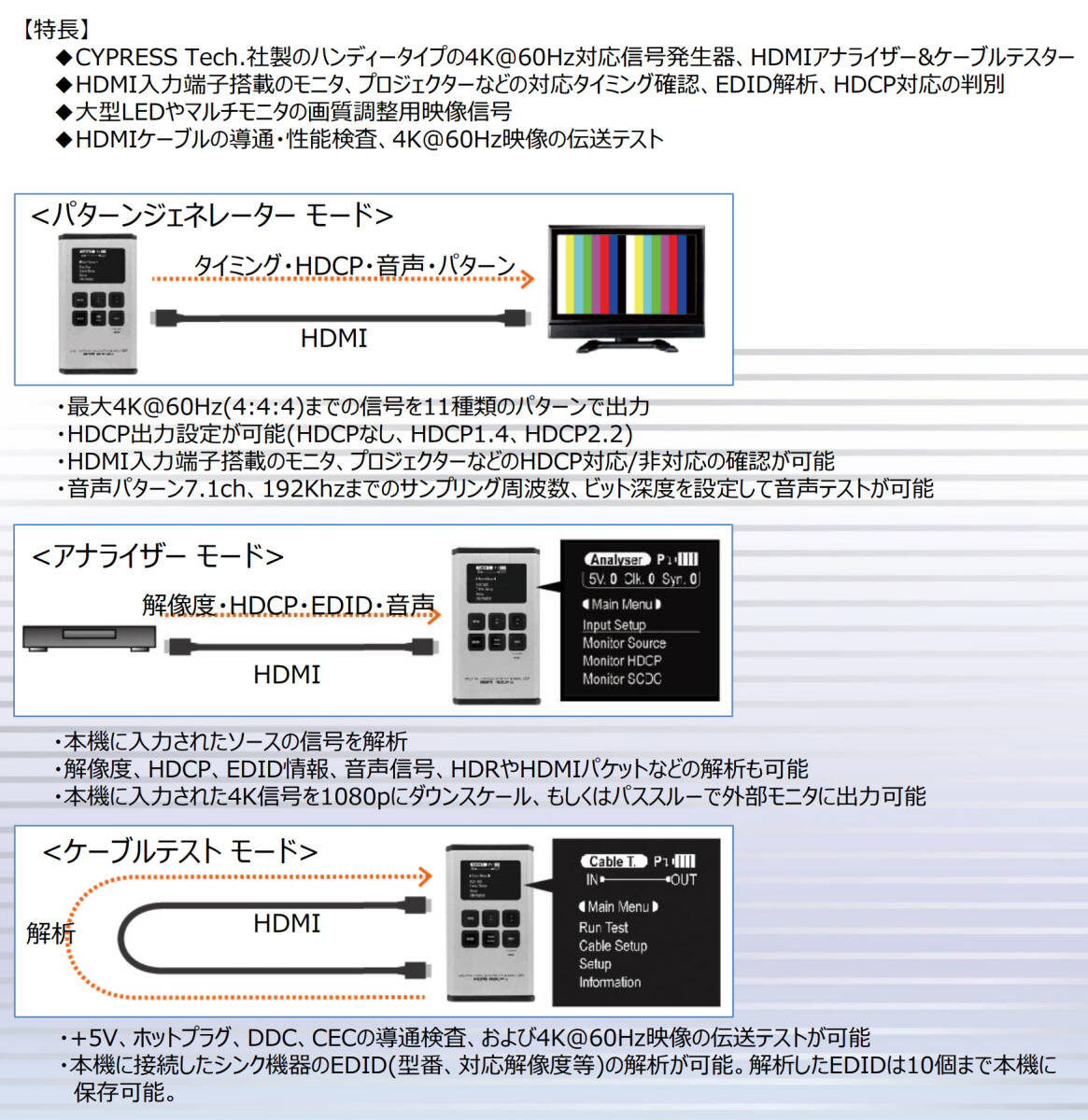 Cypress Technology社製のハンディータイプの4K@60Hz対応信号発生器 HDMIアナライザー&ケーブルテスター