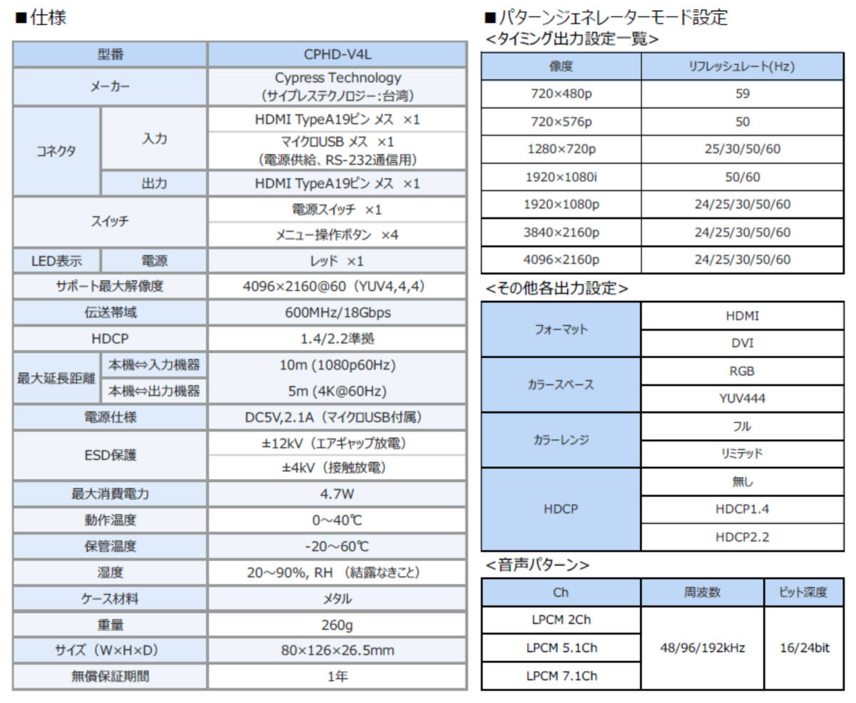 HDMIケーブルチェッカー テスター&パターンジェネレーター&アナライザー EDID解析/HDCP判別/4K60疑似信号発生 Cypress Technology CPHD-V4L