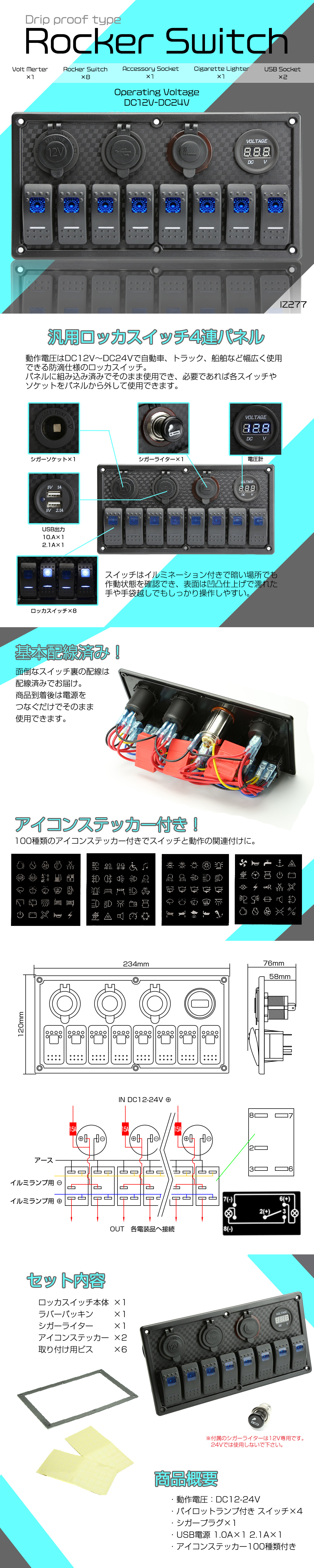 ■商品コード IZ277 ■特徴 動作電圧はDC12V?DC24Vで自動車、トラック、バス、船舶など 幅広く使用できる防滴仕様のロッカスイッチ。 パネルに組み込み済みでそのまま使用でき、必要であれば 各スイッチやソケットをパネルから外して使用できます。 スイッチはイルミネーション付きで暗い場所でも作動状態を確認できます。 スイッチ表面は凹凸があり濡れた手や手袋越しでも 操作しやすくしっかりとしたクリック感があります。 ■商品詳細: ・ 汎用ロッカスイッチパネル ・ 動作電圧:DC12-24V ・ ロッカスイッチ ×8 ・ シガーソケット ×1 ・ USB電源 1.0A×1 2.1A 各×1 ・ 電圧計 ・ 12V用シガーライター×1 ・ アイコンステッカー ・ 防滴タイプ その他ロッカスイッチは→コチラ |