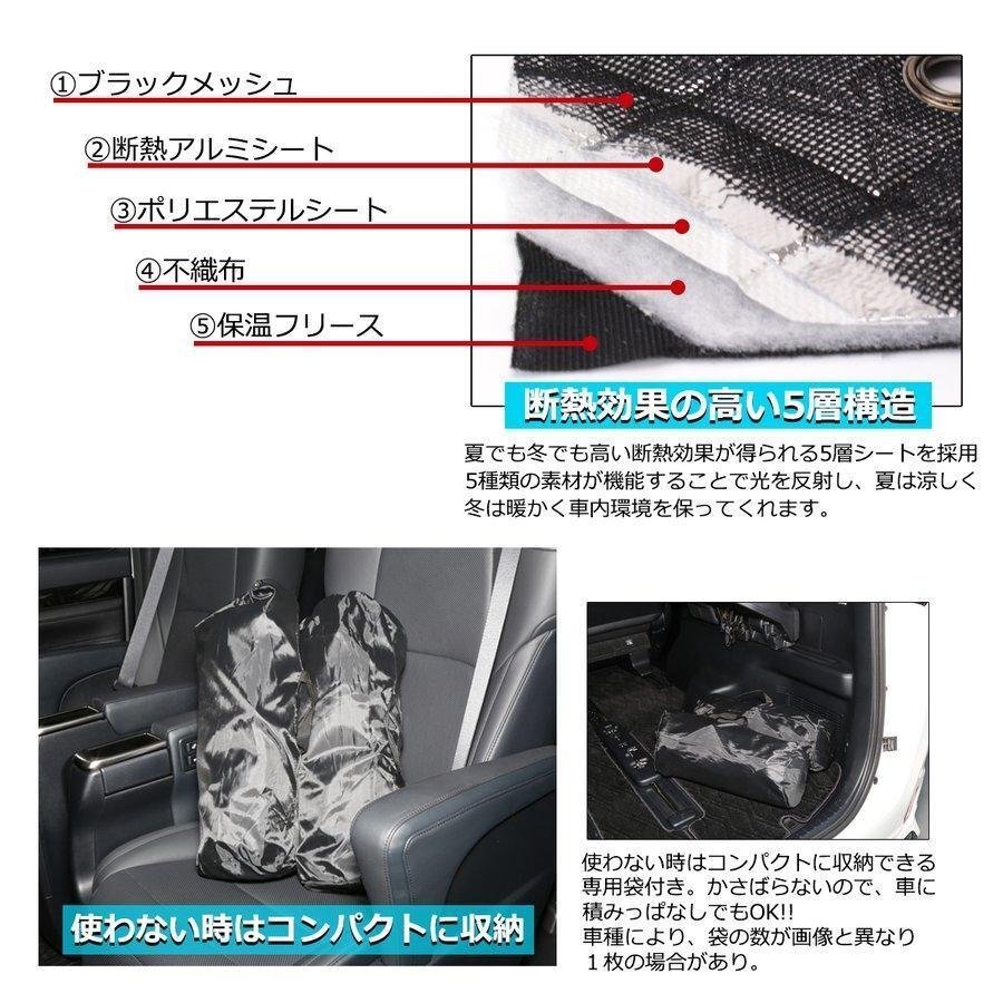 ■商品タイトル 車種別専用設計 サンシェード 全窓対応 1台分 ■適合車種 TOYOTA 40系 アルファード 40系 ヴェルファイア デジタルインナーミラー装着車用 デジタルインナーミラー非装着車はリアサンシェードの切り欠き部がリアカメラ部と一致しません。 全窓対応(10枚) ■素材 5層構造、外側から ・ブラックメッシュ ・断熱アルミシート ・不織布 ・保温フリース ■特徴 車種別専用のサンシェードです。 熱遮断・保温性に優れ、全窓対応のため、車内を覗かれる 心配がないため、カーナビなどの盗難を防げ、また、 アウトドア時の着替えや、車中泊の夜中に眠るときも 安心して睡眠がとれます。 ■注意事項 窓に取り付ける用の吸盤はサンシェードに取り付けられてはいません。 取り付けにお時間がかかりますので、初回使用前に あらかじめ取り付けて置くことをお勧めします。 |