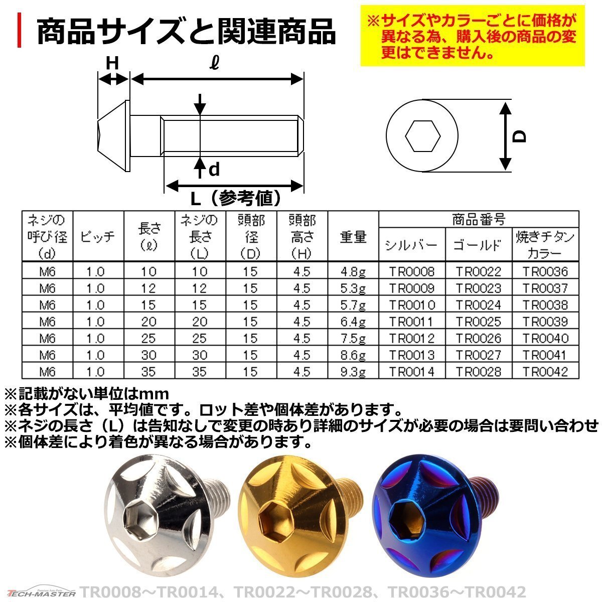 ボタンボルト 六角穴付きネジ 数量:1個売り 材質:ステンレス 商品サイズ:M6×25mm P1.0(詳細は画像に掲載。各サイズは、参考サイズです。ロット差や個体差があります。) ネジの長さ:25mm(告知なしで変更の時あり、詳細のサイズが必要な場合は要問い合わせ。) 適合車種:汎用タイプ。サイズ等でご判断ください。なお、適合車種に関しての回答は致しておりません。 商品カラー:ゴールド ※サイズやカラーごとに価格が異なる為、購入後の商品の変更はできません。 ※個体差により着色が異なる場合があります。 また、ご購入数しかお取引ができません。 数量以上ご必要の場合は、ご入札前にご質問ください。 在庫がございましたら別途出品させていただきます。 |