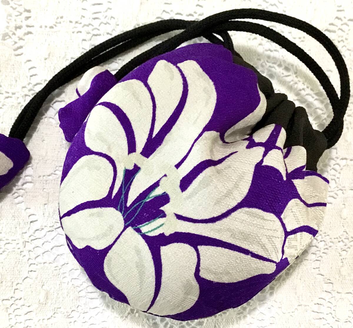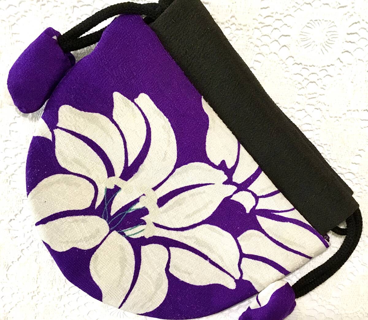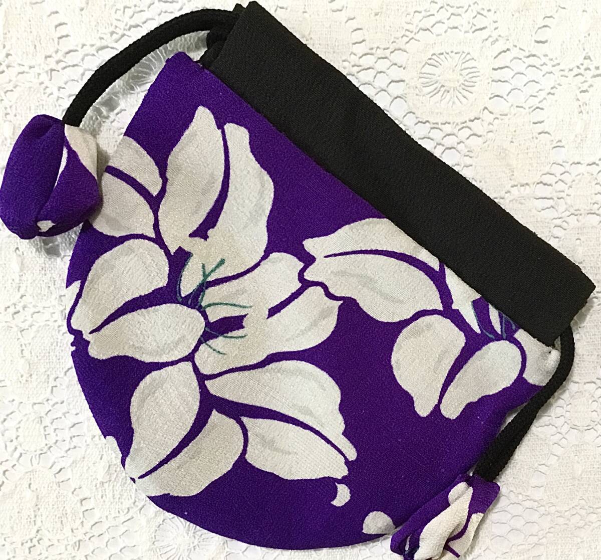 ■時代物の正絹着物地(紺紫色地にデザインされたユリ柄・・・紋綸子)で作った、とっても可愛い小袋です。