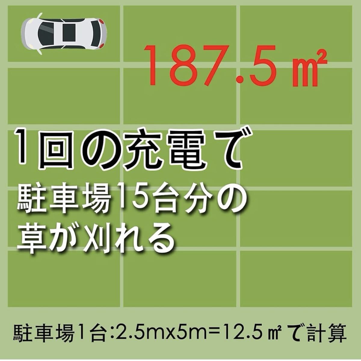 超軽量&コードレス設計|狭い庭に最適!狭い日本庭園や斜面作業に特化。女性向け軽量草刈り機設計により、高齢者の腰にも優しい長時間作業を実現します。1回の充電で駐車場15台分の草刈りが可能。1充電あたりの作業面積目安56坪(187m2)※草丈約30cmの場合。バッテリーの状態や草の種類・時期により作業量は変わります。