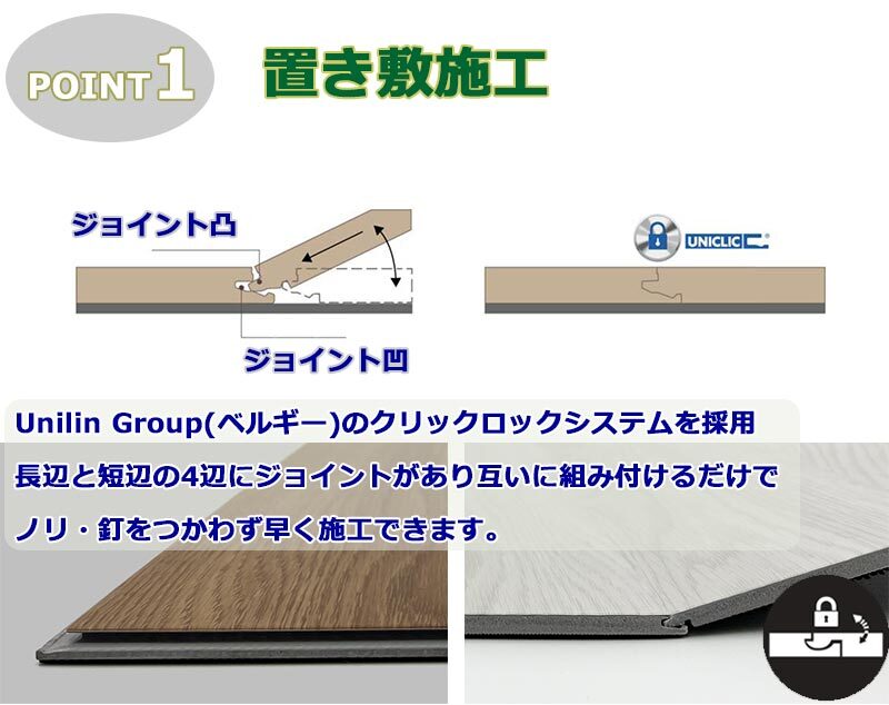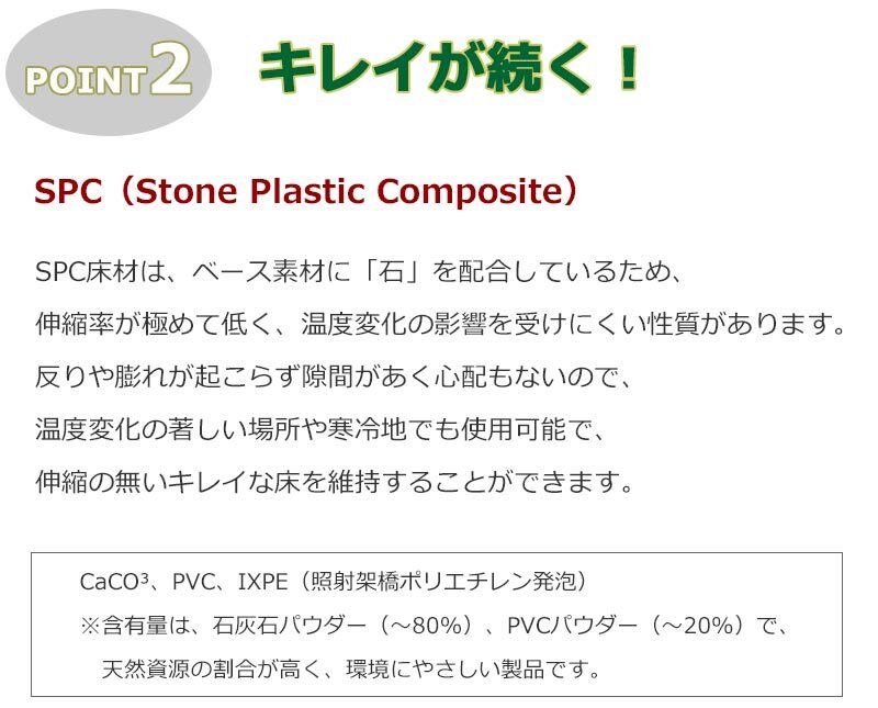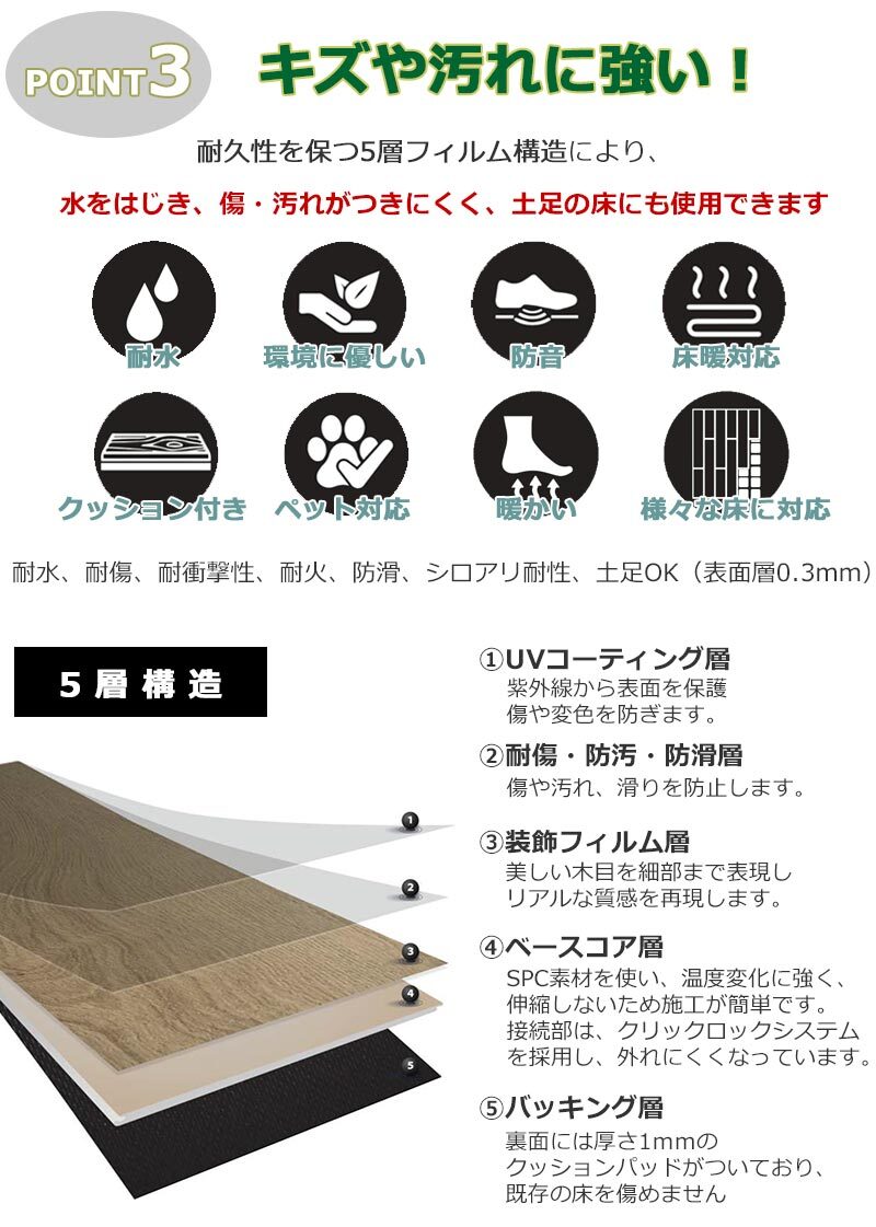反りや伸縮に強いSPC素材で、水に強く、床暖房・土足にも対応、裏面のクッションパッドで既存の床を傷つけることもありません。