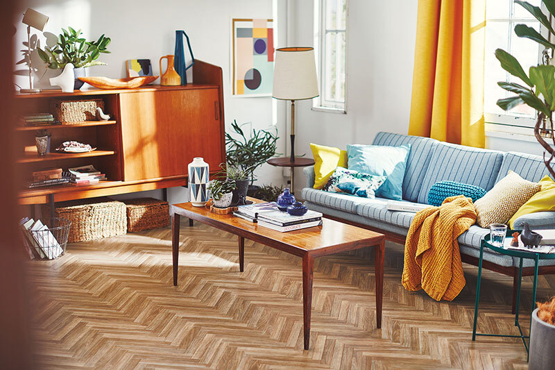 板の面差がある細幅のヘリンボーン。鮮やかなファブリックと組み合わせて、北欧風スタイルに。