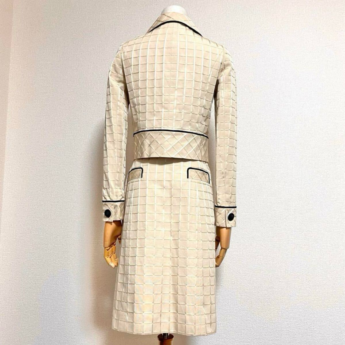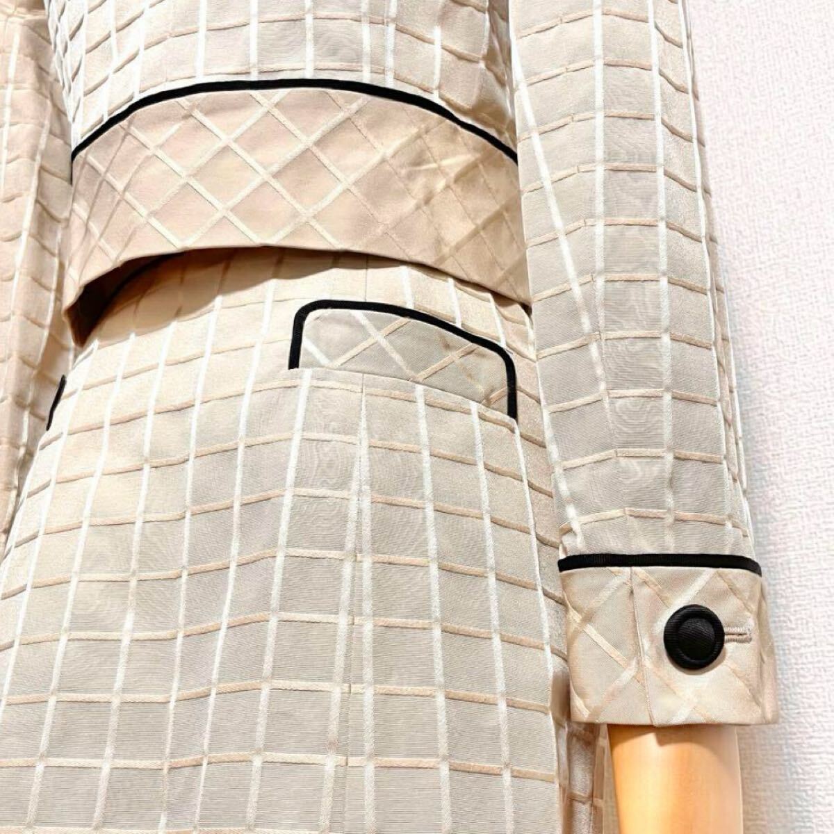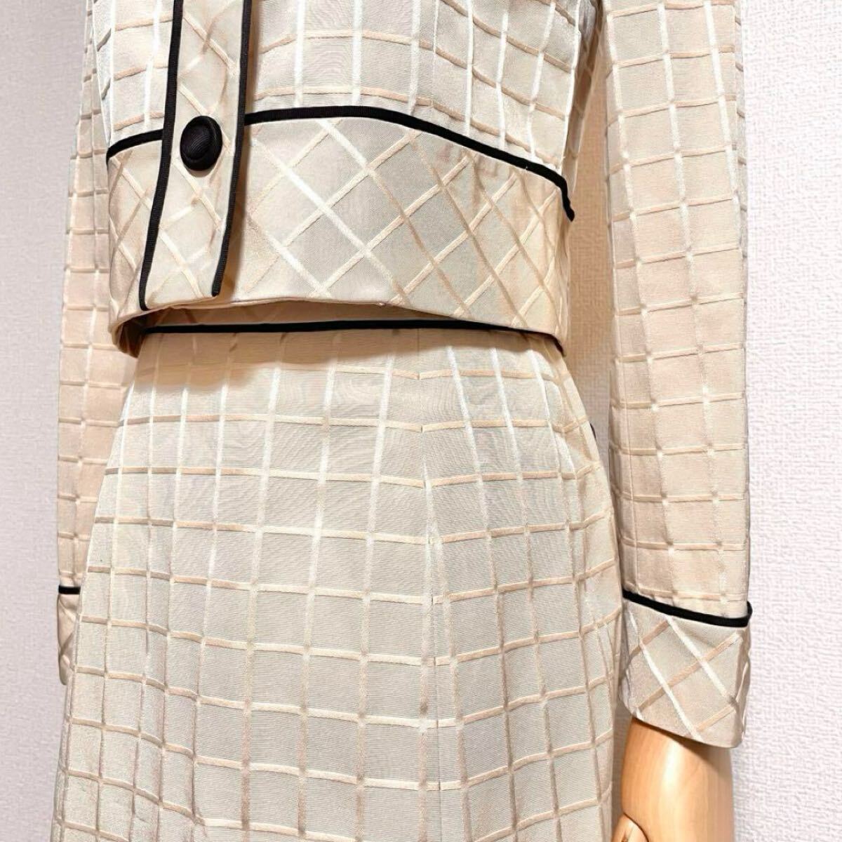 チェック柄、格子柄、立体ジャガード、スタンドカラー、セレモニー、フォーマル、スカートスーツ、セットアップ
