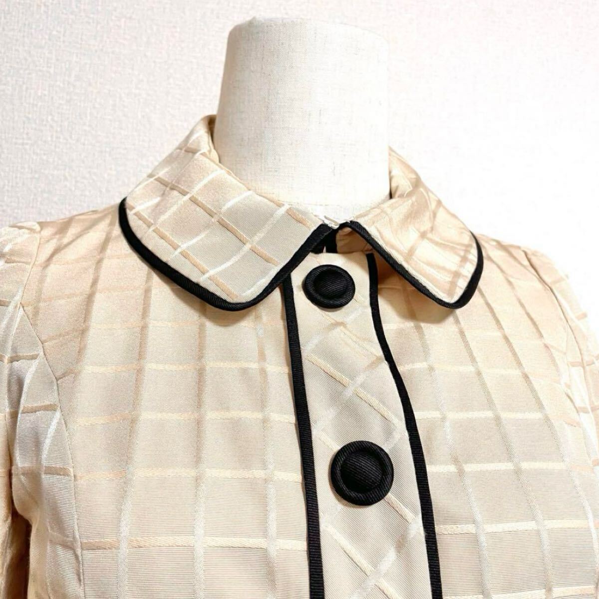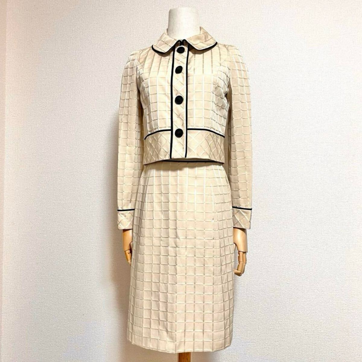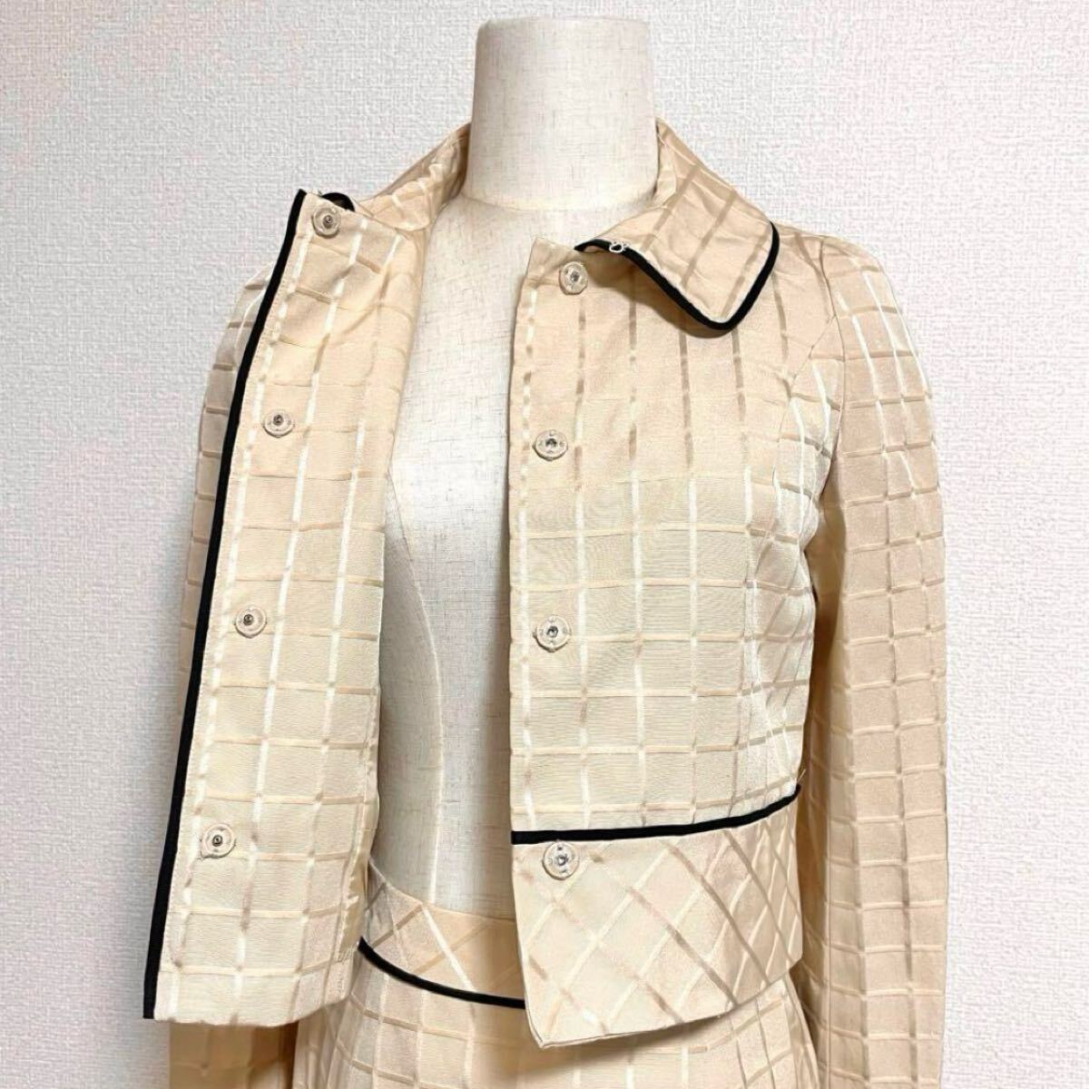チェック柄、格子柄、立体ジャガード、スタンドカラー、セレモニー、フォーマル、スカートスーツ、セットアップ