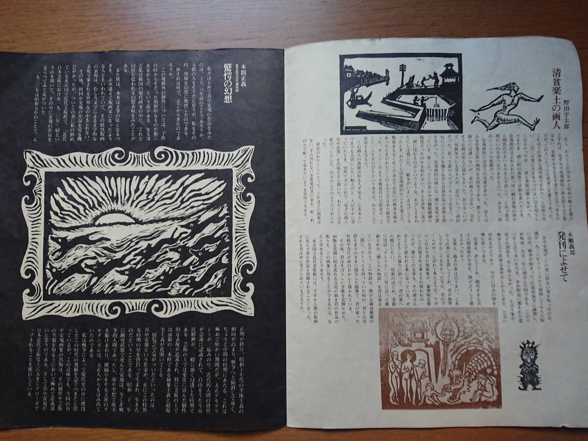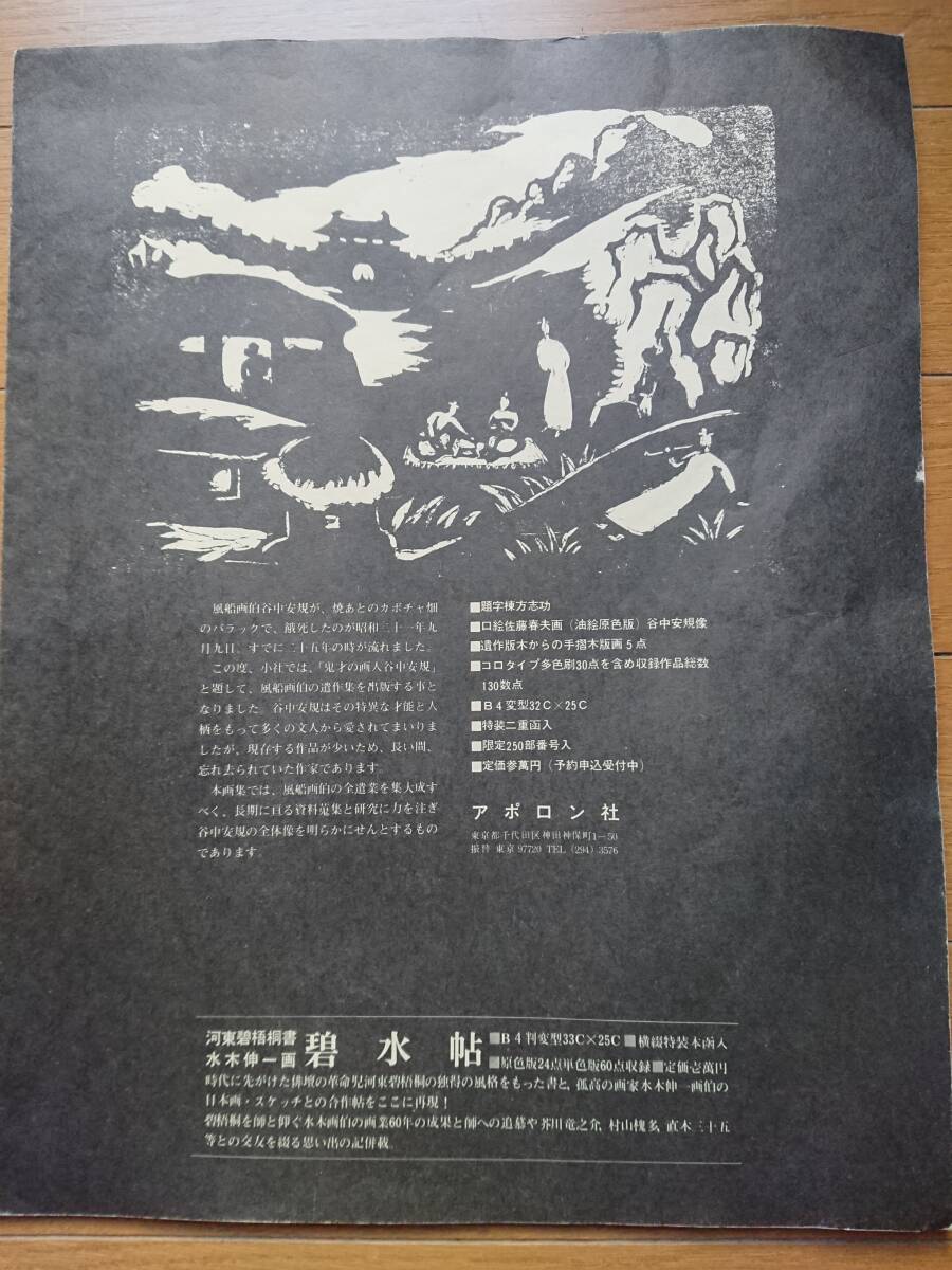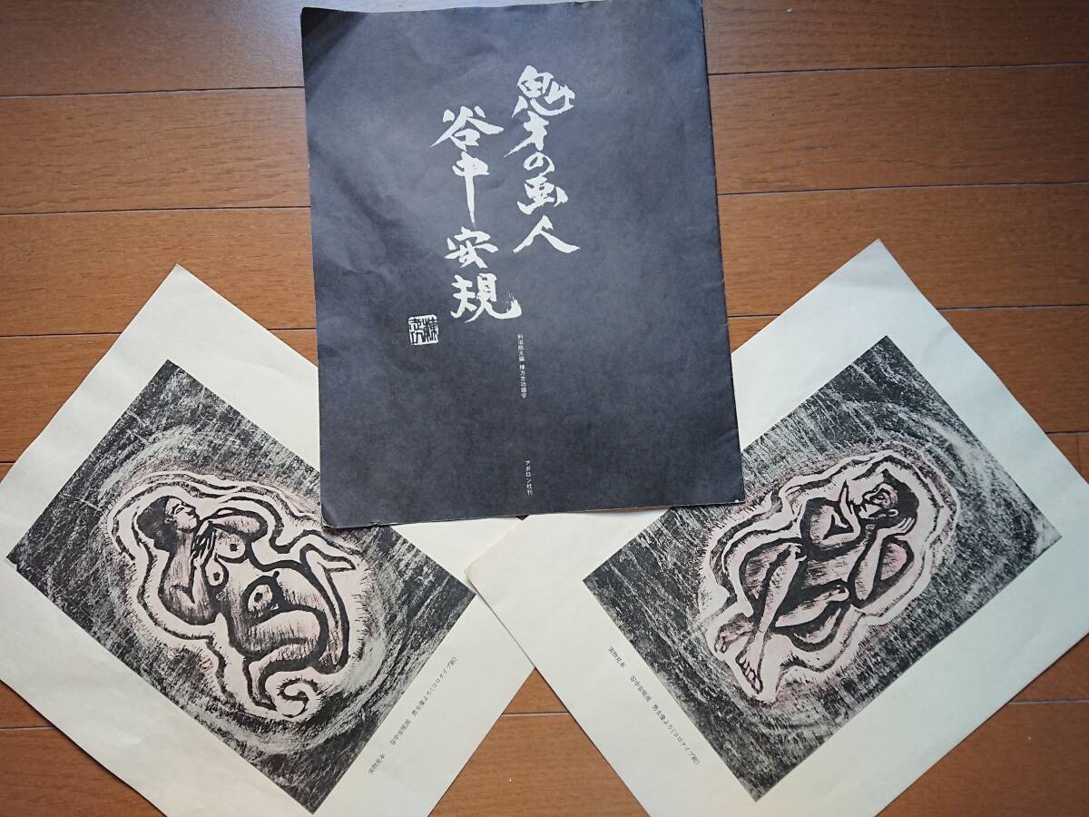 こちらは鬼才、評価されつつも戦後すぐに餓死という孤独死で死後に評価が高まった風船画伯こと谷中安規氏の画集「鬼才の画人 谷中安規 限定250部」(アポロン社)その貴重な発刊記念宣伝冊子です。谷中安規コロタイプ刷り見本2枚付きです。大型の4P+見本刷り2枚。題字はあの、世界的にも知られた棟方志功氏。