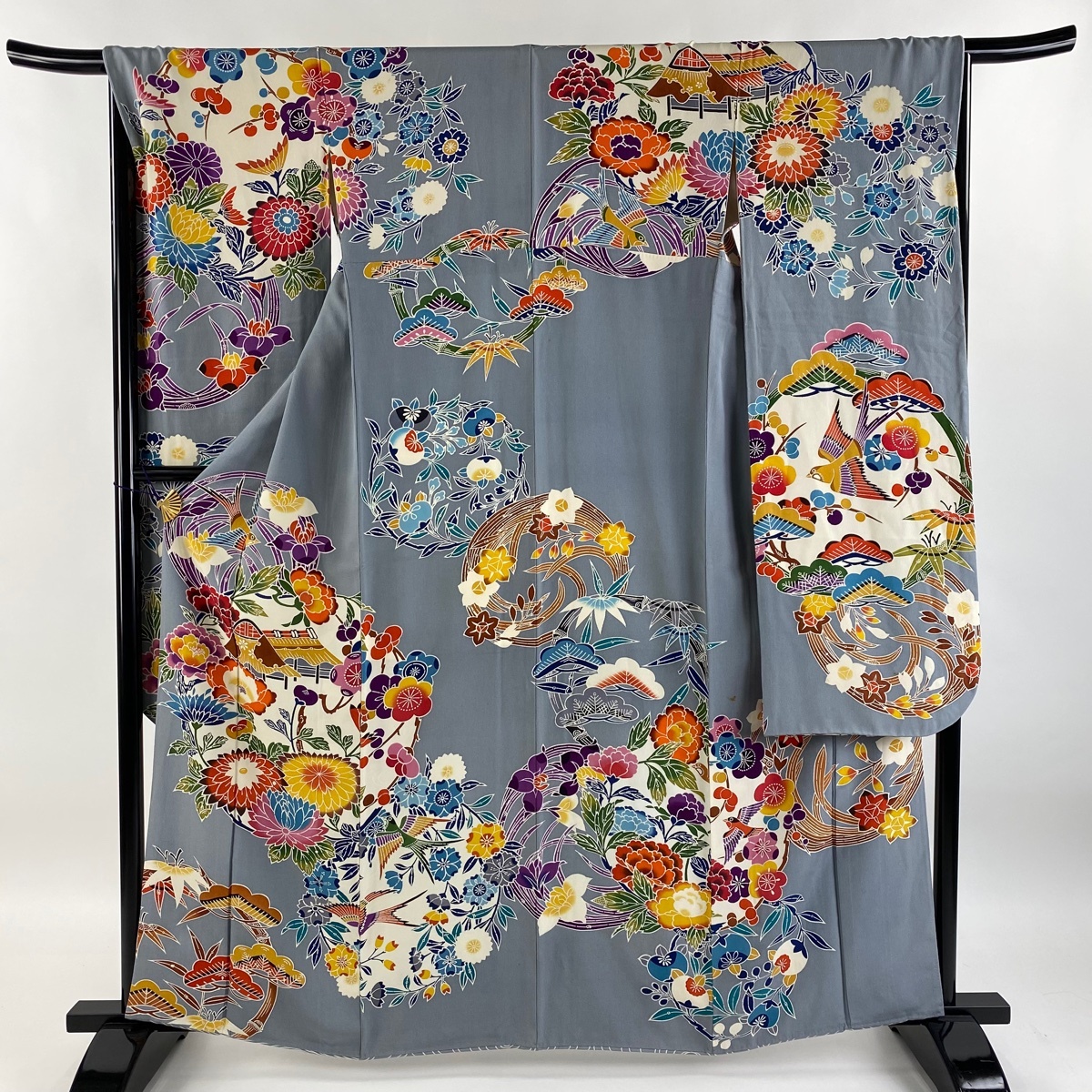 振袖 名品 松竹梅 建物 灰色 袷 身丈162 裄丈67 M 正絹 【中古】 |