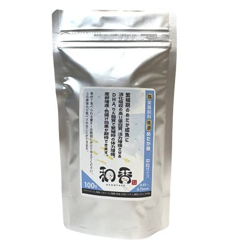 「和香 特選 メダカ 餌 (中粒: 繁殖 産卵 用) 100g 食付 高栄養 色揚 熱帯魚 金魚 に的」▼▼(商品説明)中粒 100gオレンジ/100グラム (x 1)/-・PatternName:中粒 繁殖期産卵用 100g・類似品に注意中粒サイズは0.45-0.75mm(産卵繁殖期用)・産卵数の増加を期待できます・数分で食べきる量を1日に数回程度与えてください・食いつきの良さ成長の早さが評判となっていります・成体のめだかにはもちろん、産卵や繁殖時の栄養強化に。水に浮く浮上性の餌の為、めだかが食べやすく、水も汚れにくいです。熱帯魚、グッピー、ベタ、ネオンテトラ、エンゼルフィッシュなどの魚にもおすすめです。
