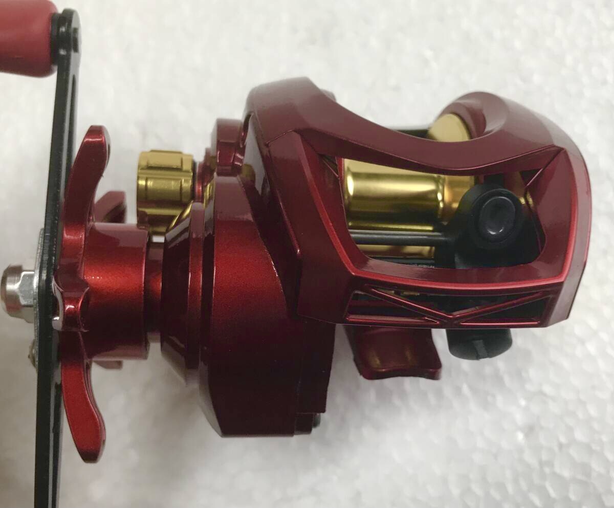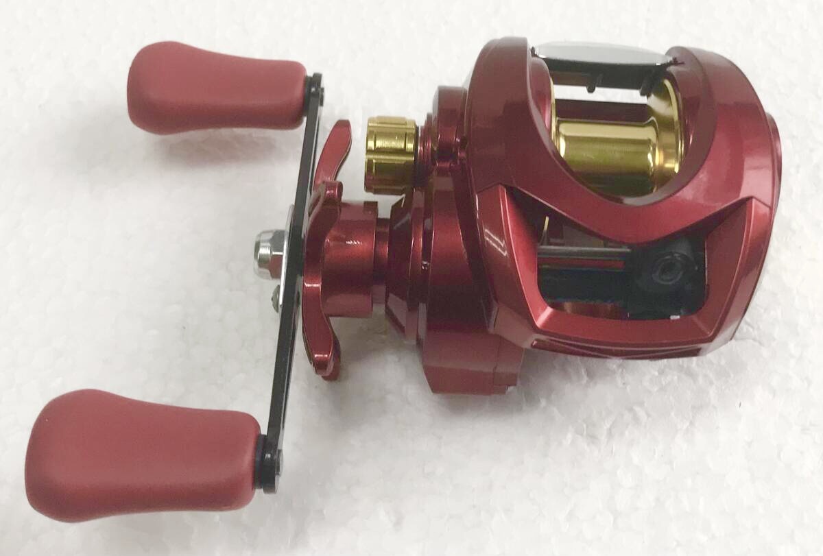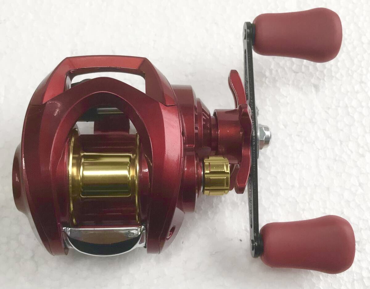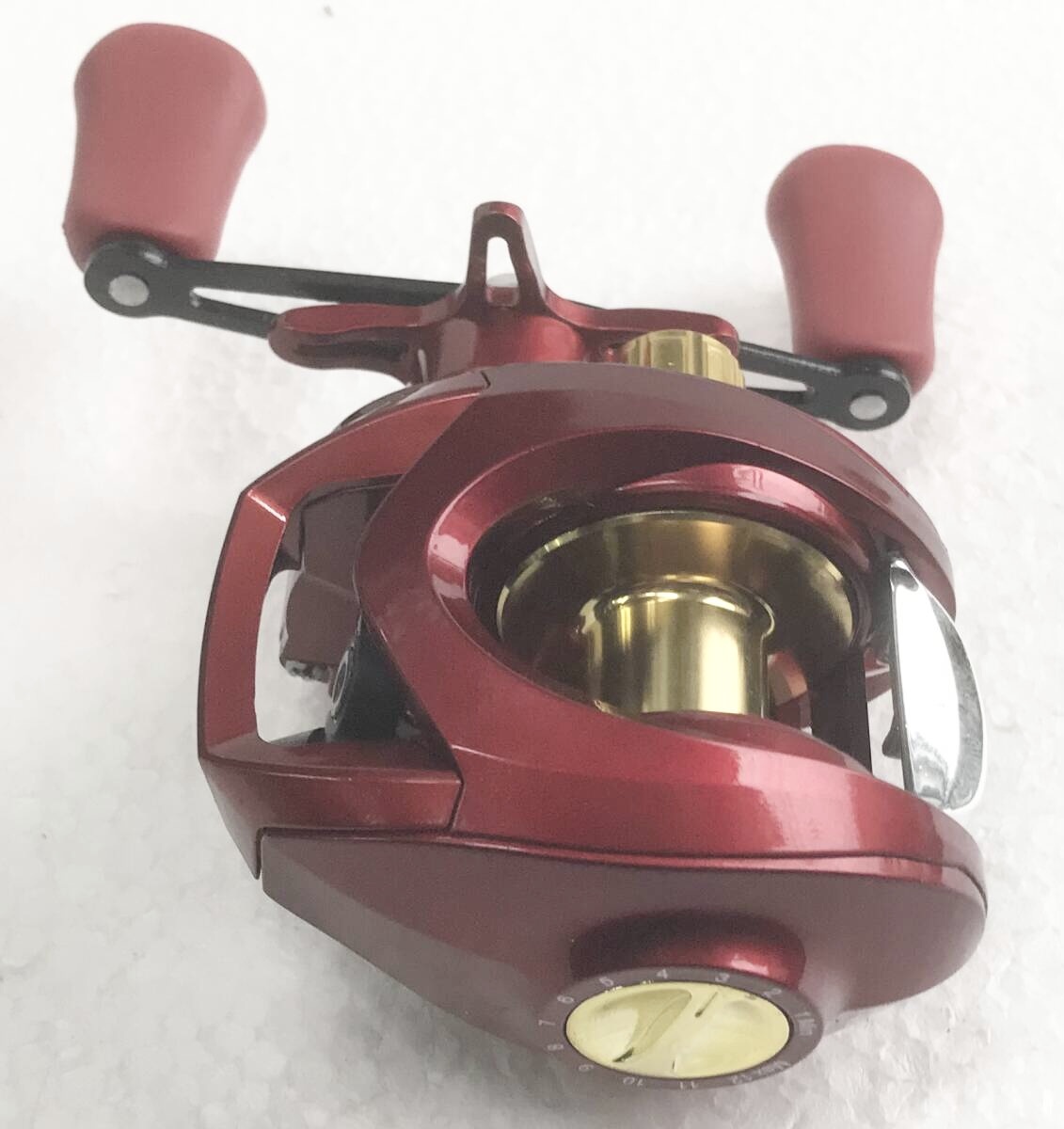 写真のDASNAKIベイトキャスティングリール レッドメタリック右ハンドル(新品未使用)を発送します(送料無料)。
