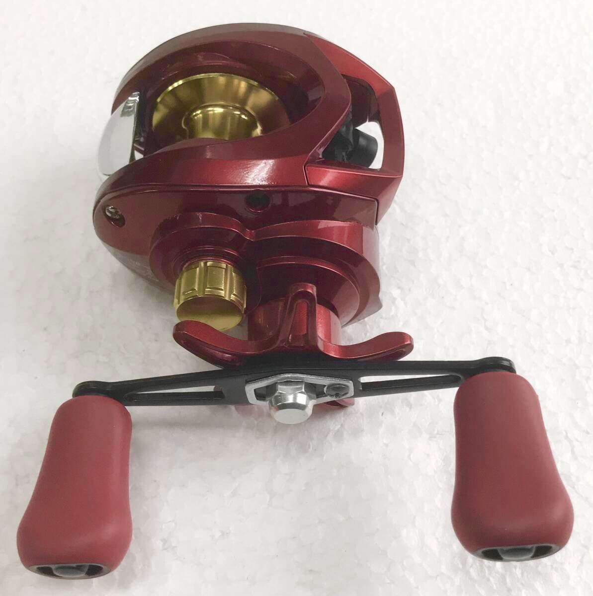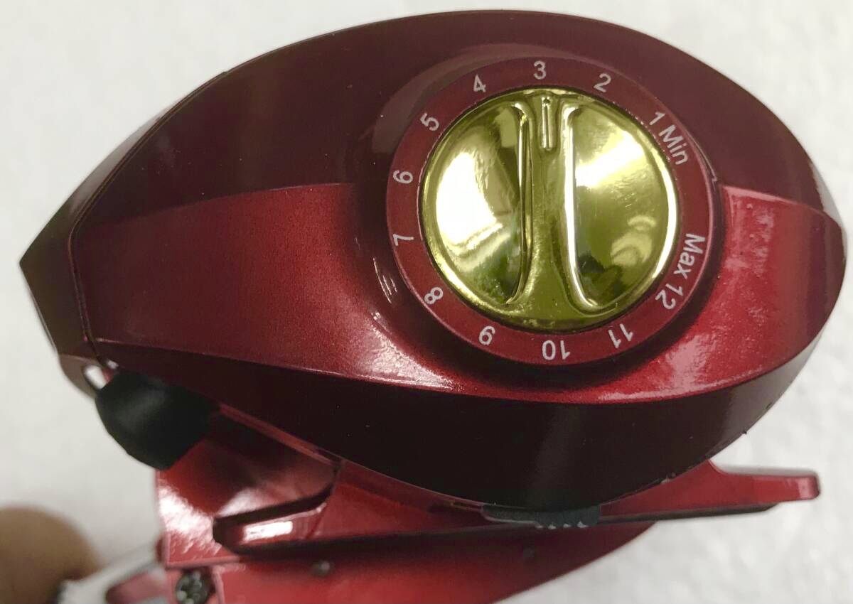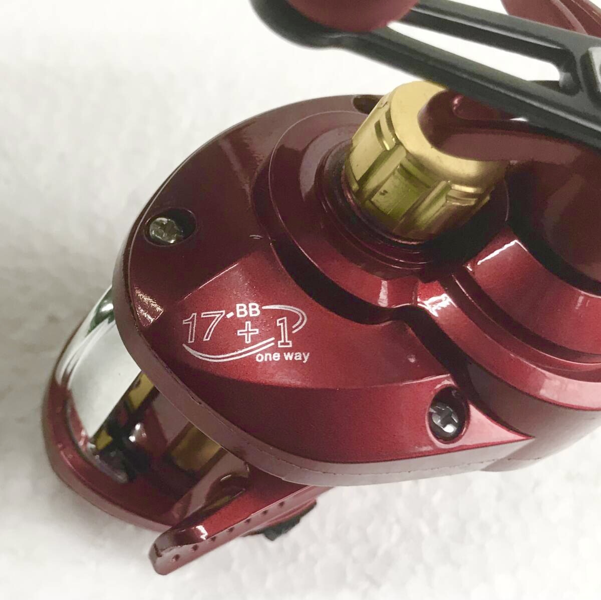 写真のDASNAKIベイトキャスティングリール レッドメタリック右ハンドル(新品未使用)を発送します(送料無料)。