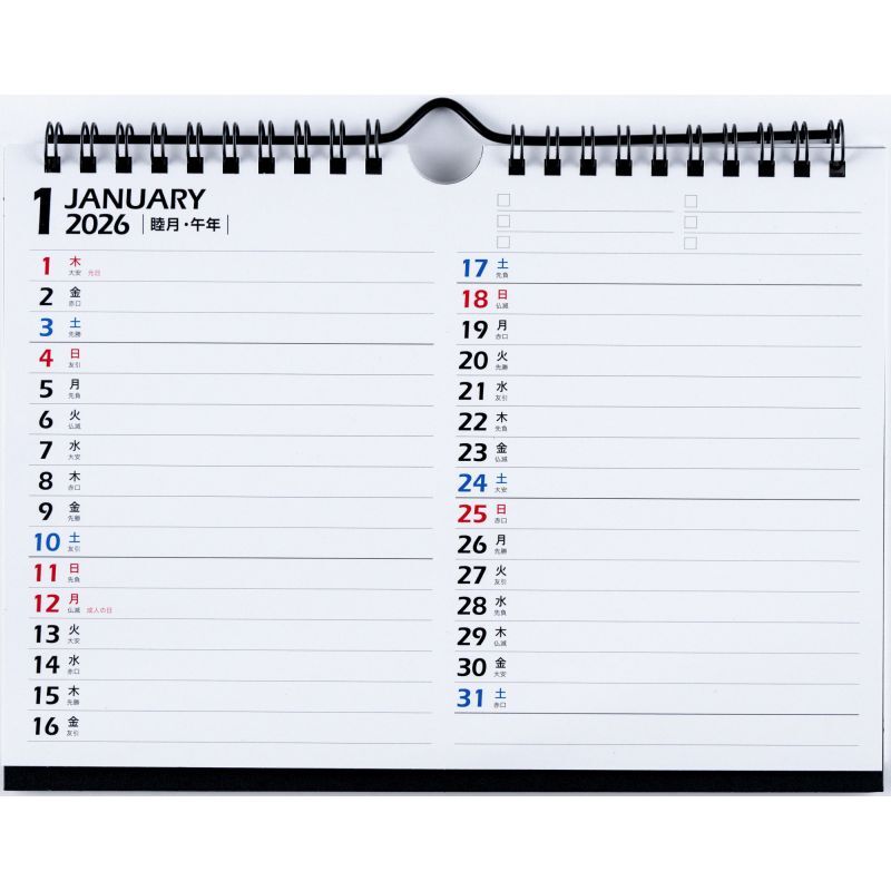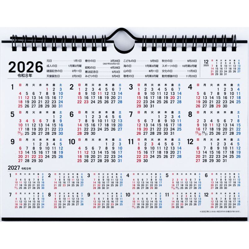 シンプルでスッキリとしたデザインで、あらゆるシーンに対応。壁掛にも卓上にもなる、使い勝手のよいカレンダーです。裏面の横ケイ式カレンダーは、長期的な予定や進捗の管理に便利です。2年分を一覧できる年間カレンダーが付いているので、長期計画もしっかりサポートしてくれます。エコで地球にやさしい、シンプルな壁掛・卓上兼用タイプのカレンダー[A5サイズ]